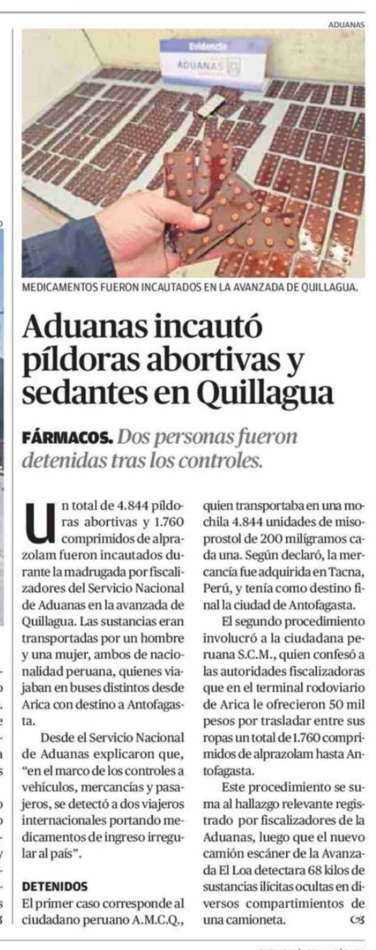Aduanas incautó píldoras abortivas y sedantes en Quillagua 04-04-2026 El Mercurio de Calama |