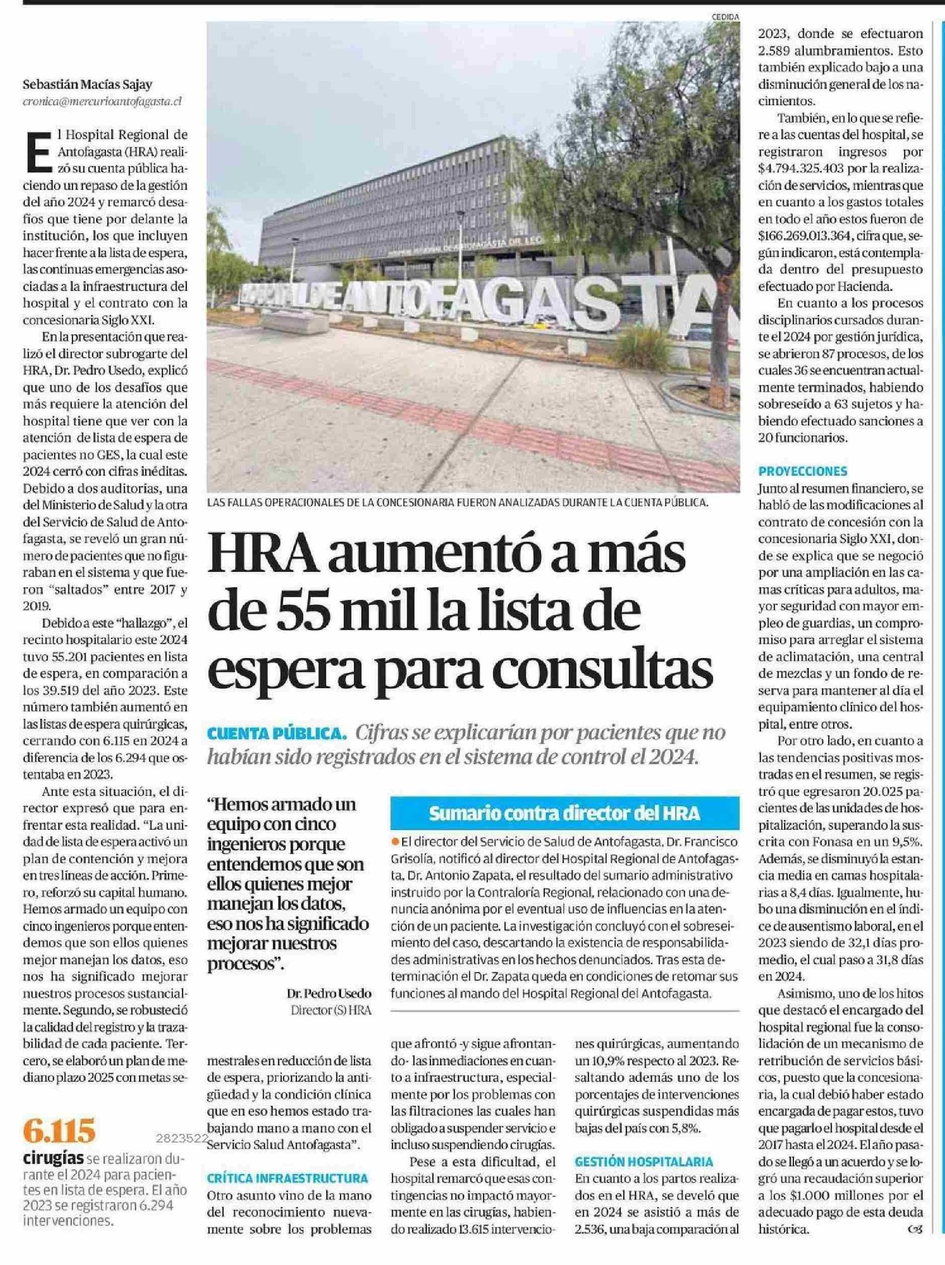 HRA aumentó a más de 55 mil la lista de espera para consultas 20-06-2025 El Mercurio de Calama |