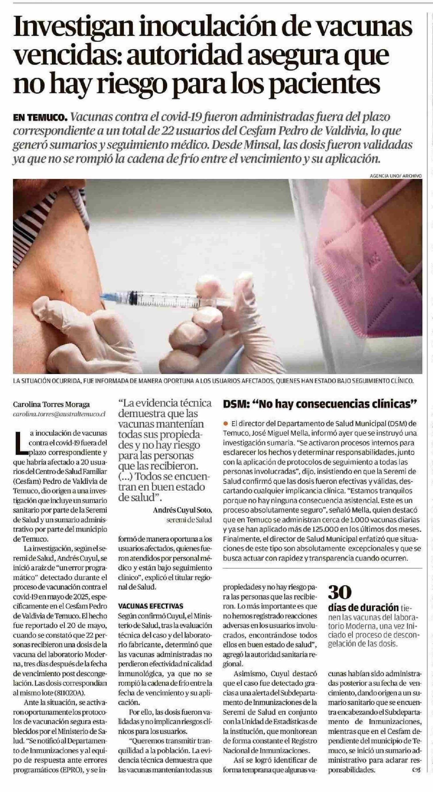 Investigan inoculación de vacunas vencidas: autoridad asegura que no hay riesgo para los pacientes 13-06-2025 El Austral de la Araucanía |