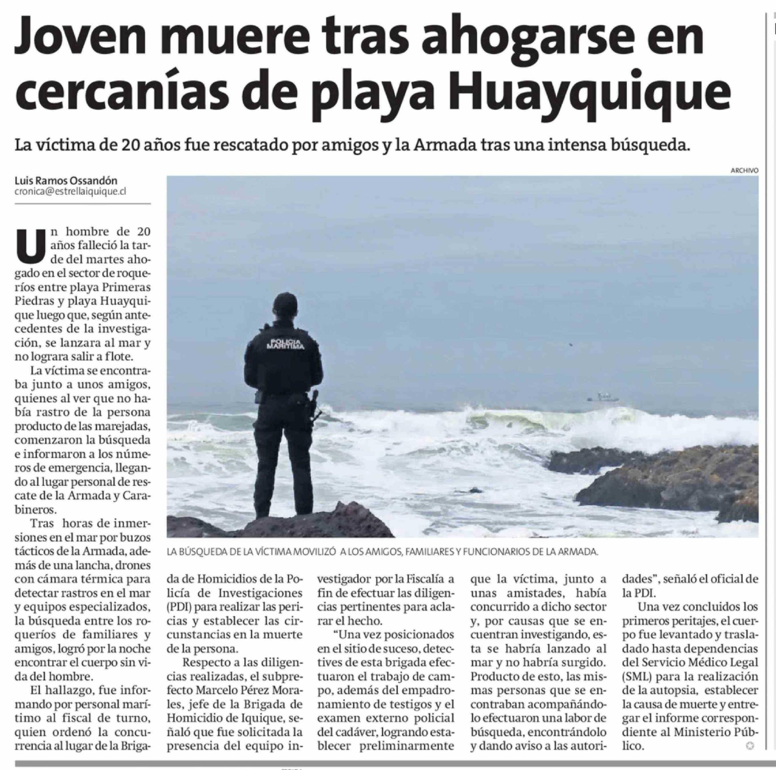 | Título: | Joven muere tras ahogarse en cercanías de playa Huayquique |