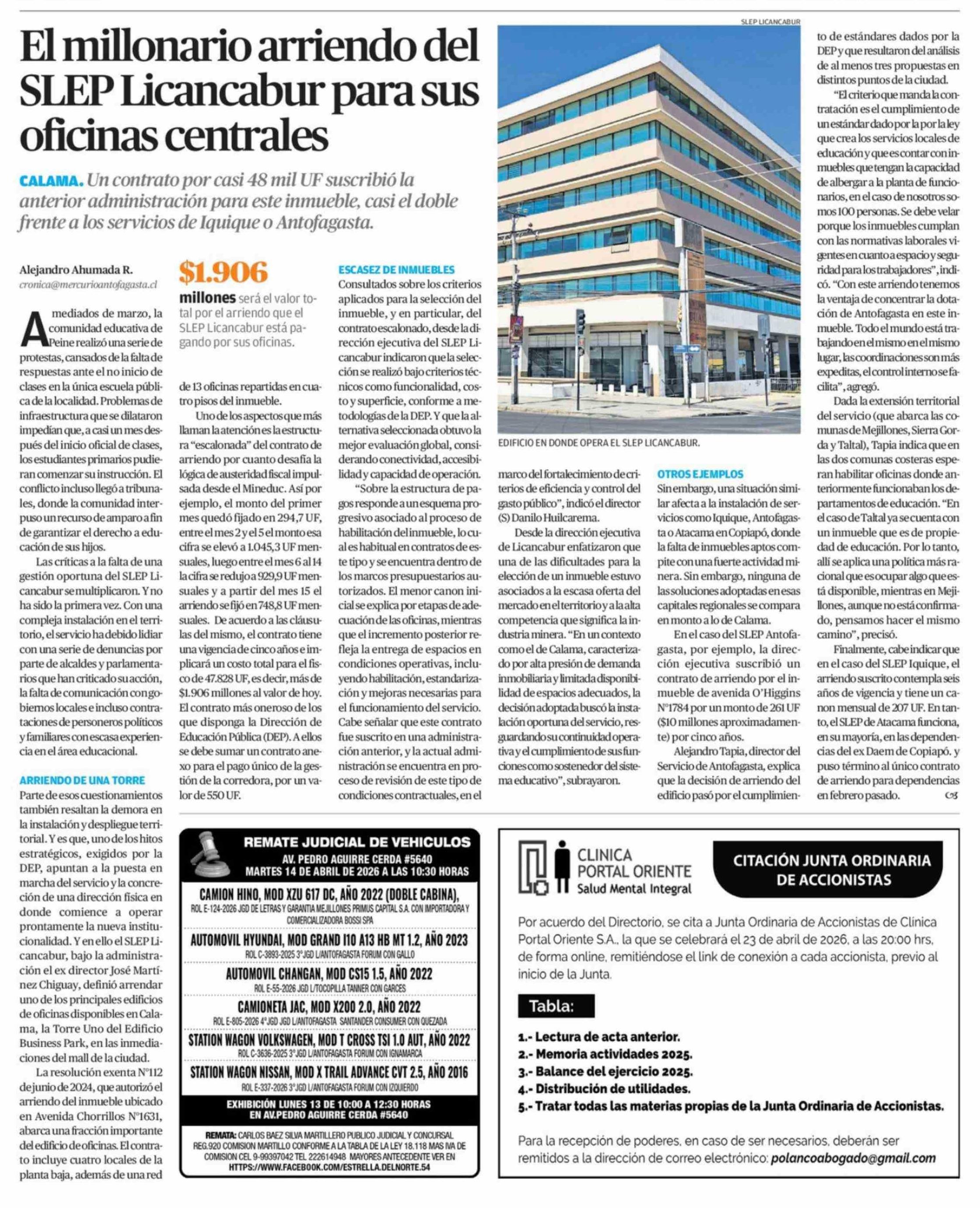 El millonario arriendo del SLEP Licancabur para sus oficinas centrales 12-04-2026 El Mercurio de Antofagasta |