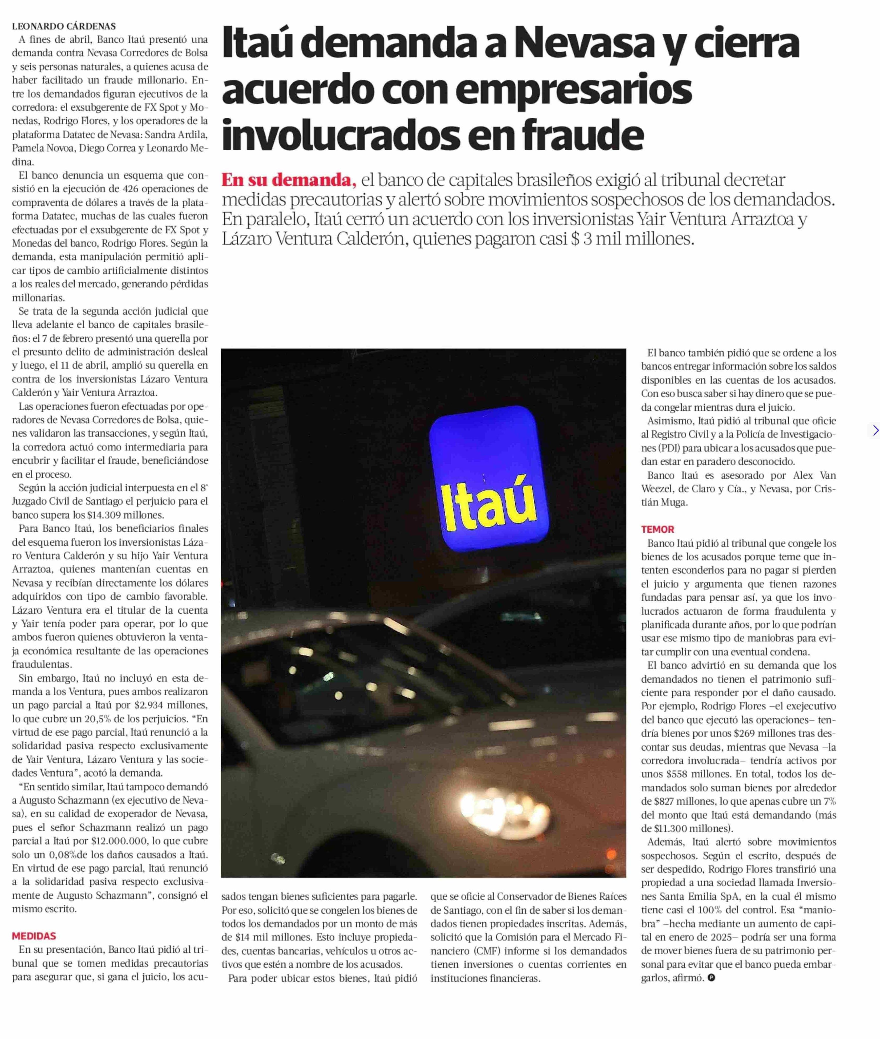 Itaú demanda a Nevasa y cierra acuerdo con empresarios involucrados en fraude 10-06-2025 La Tercera |