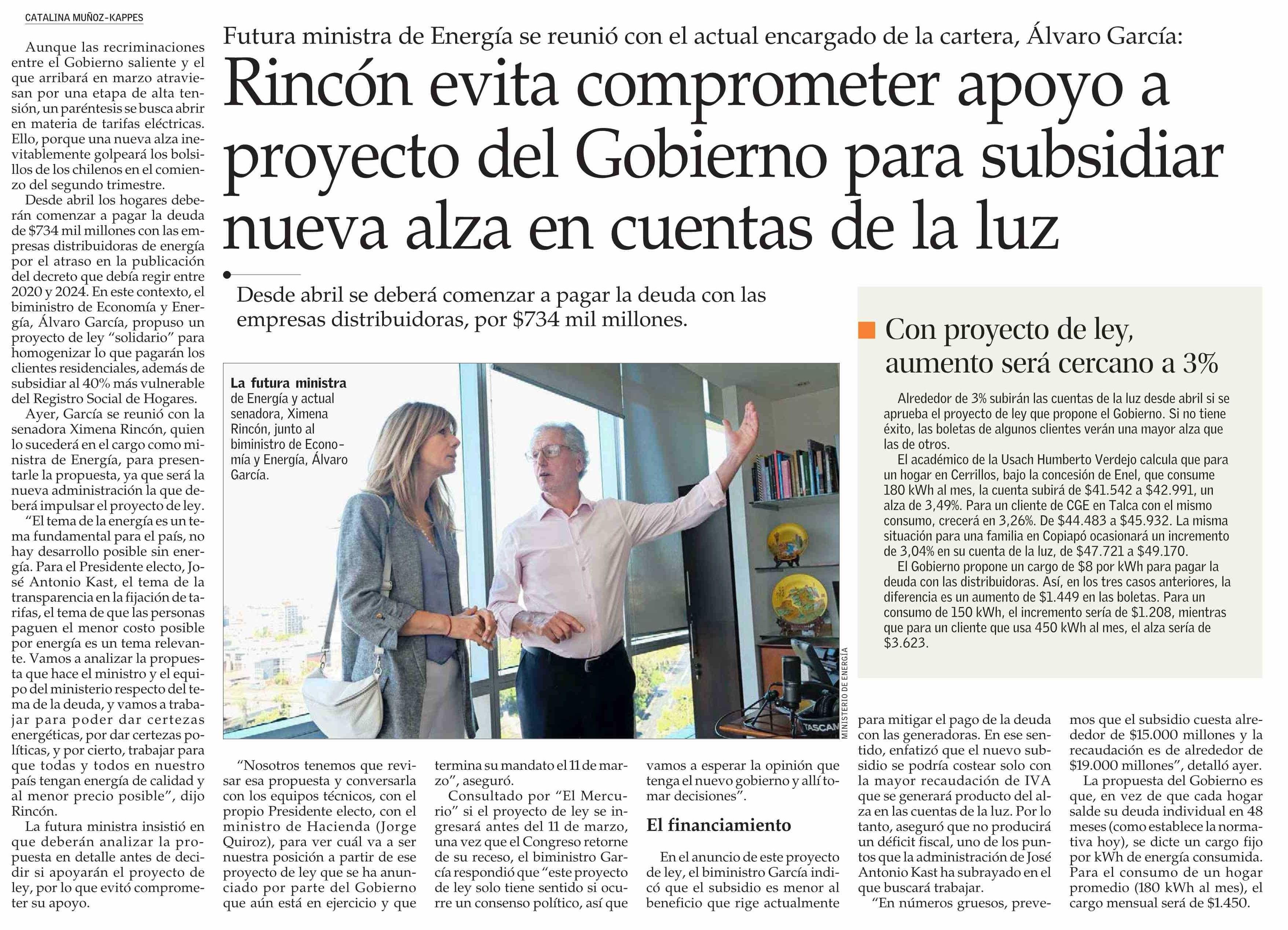 Título: Rincón evita comprometer apoyo a proyecto del Gobierno para subsidiar nueva alza en cuentas de la luz