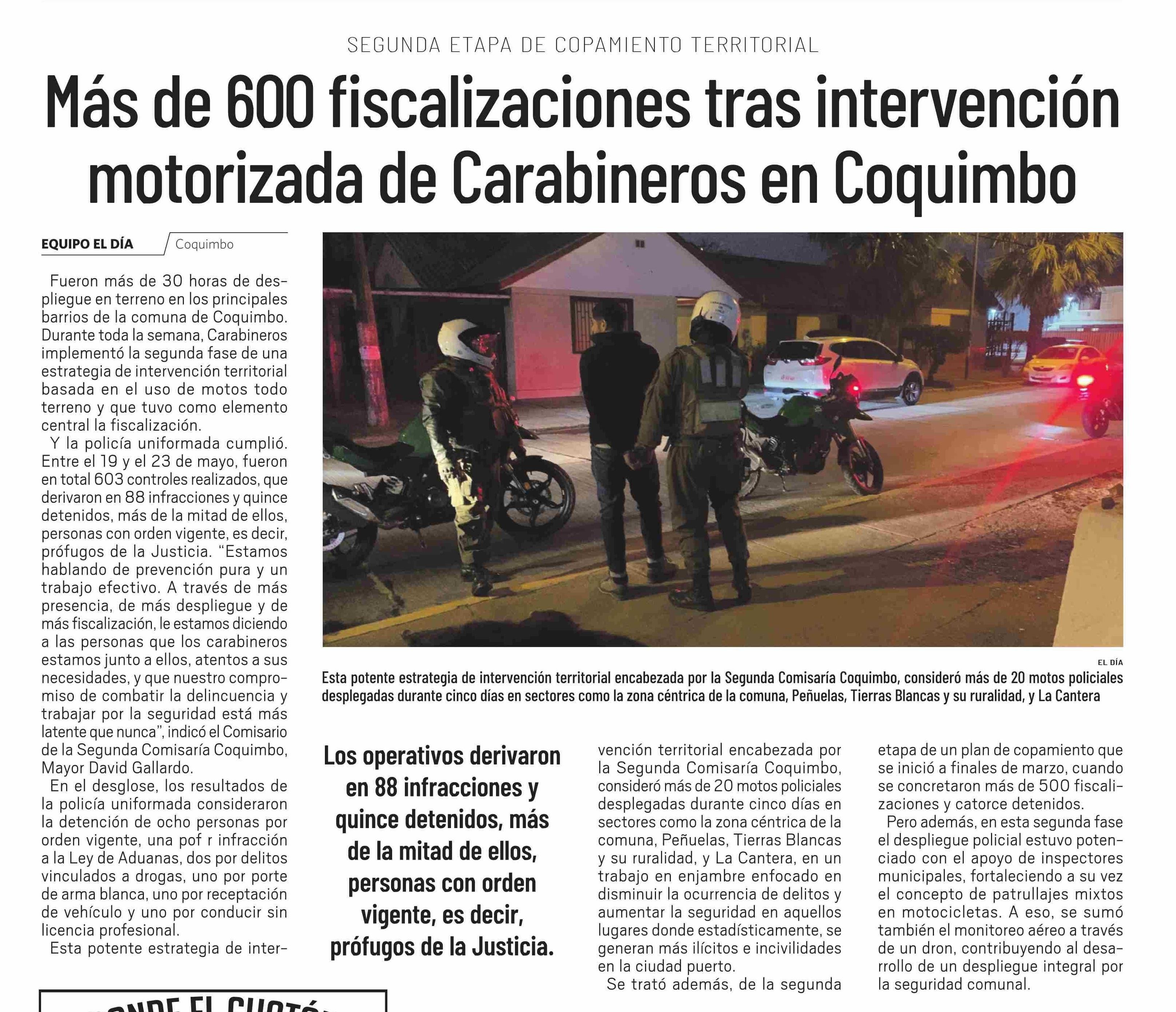 Más de 600 fiscalizaciones tras intervención motorizada de Carabineros en Coquimbo 25-05-2025 El Día |