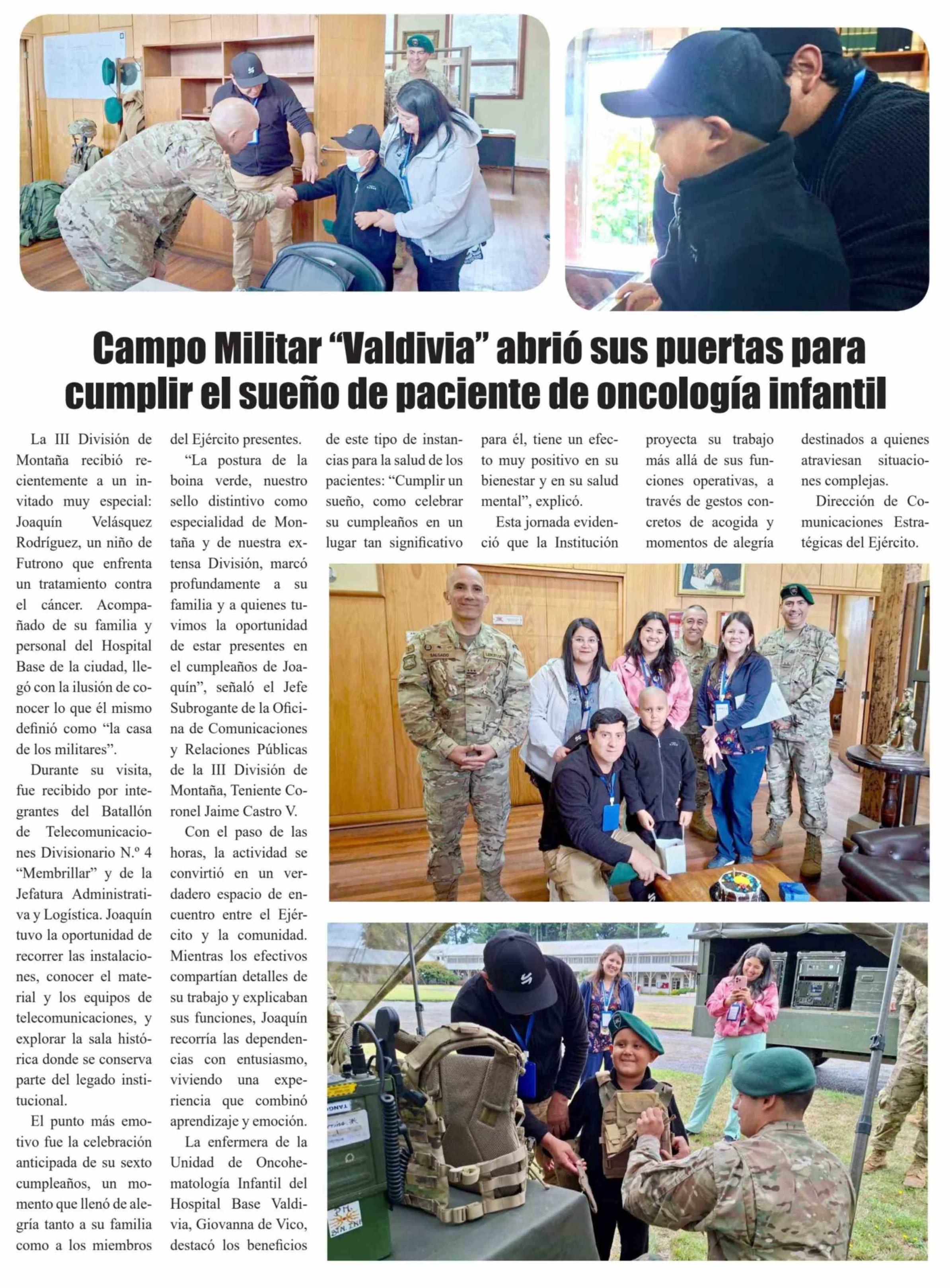 | Título: | Campo Militar "Valdivia" abrió sus puertas para cumplir el sueño de paciente de oncología infantil |