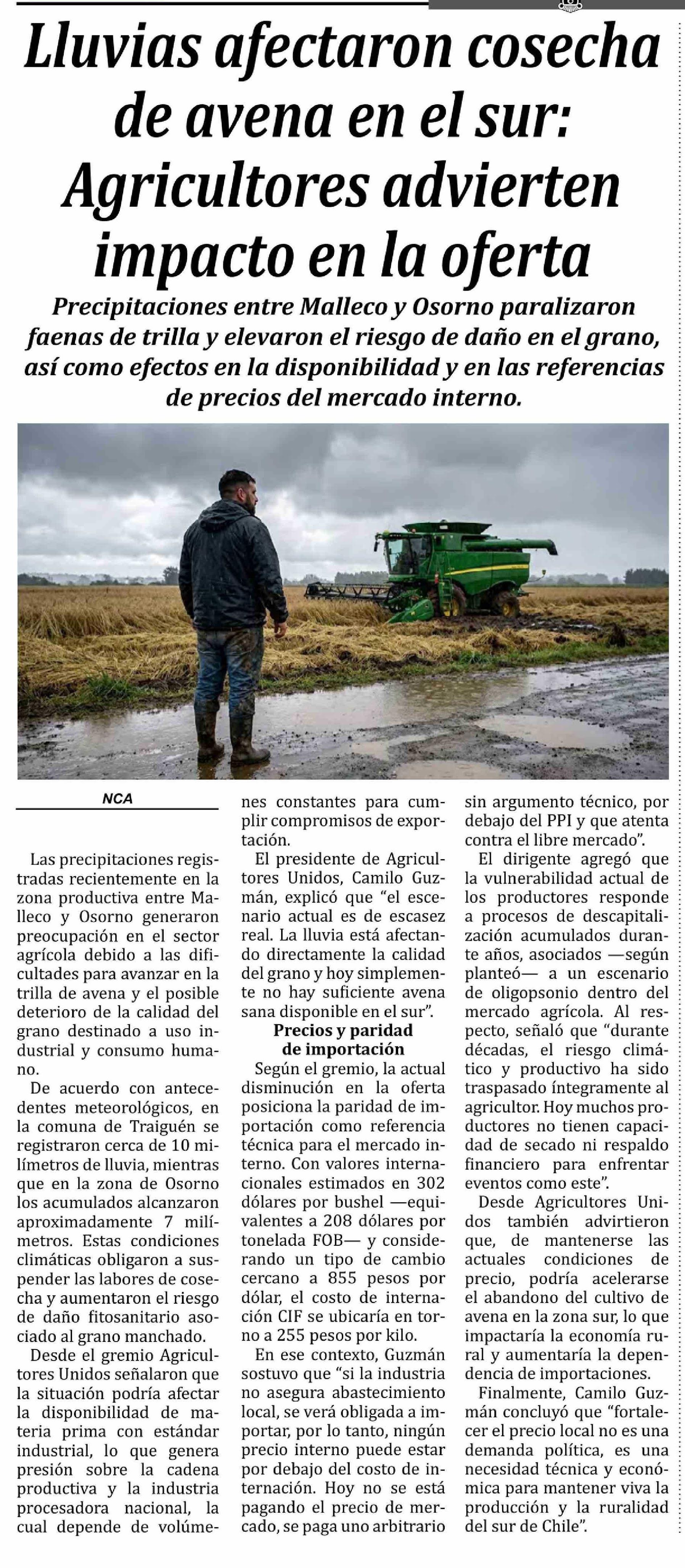 | Título: | Lluvias afectaron cosecha de avena en el sur: Agricultores advierten impacto en la oferta |
