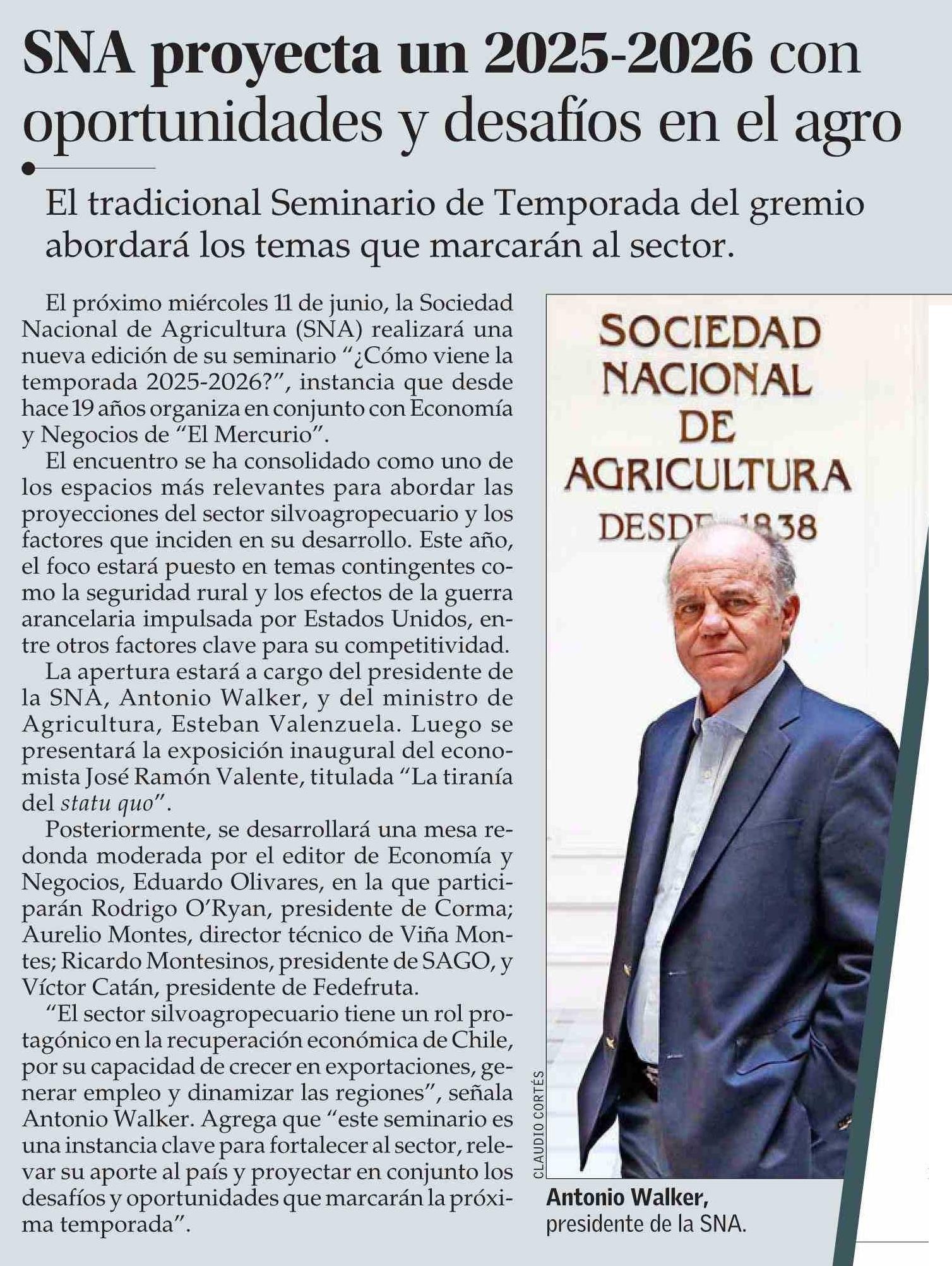 SNA proyecta un 2025-2026 con oportunidades y desafíos en el agro 09-06-2025 El Mercurio |