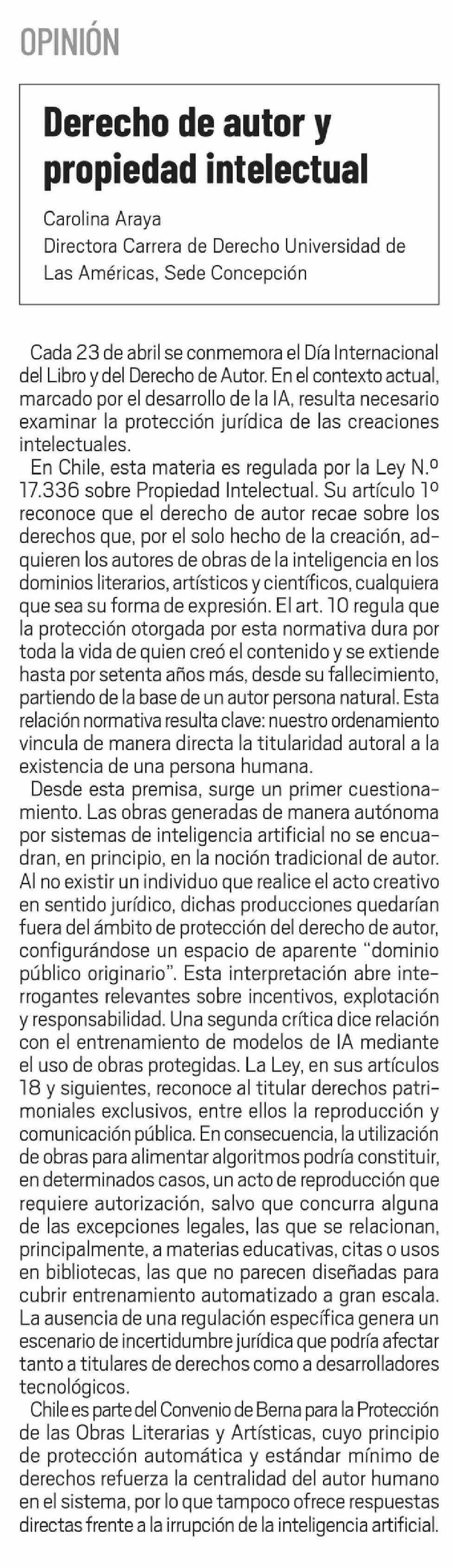 Columnas de Opinión: Derecho de autor y propiedad intelectual 24-04-2026 El Día |