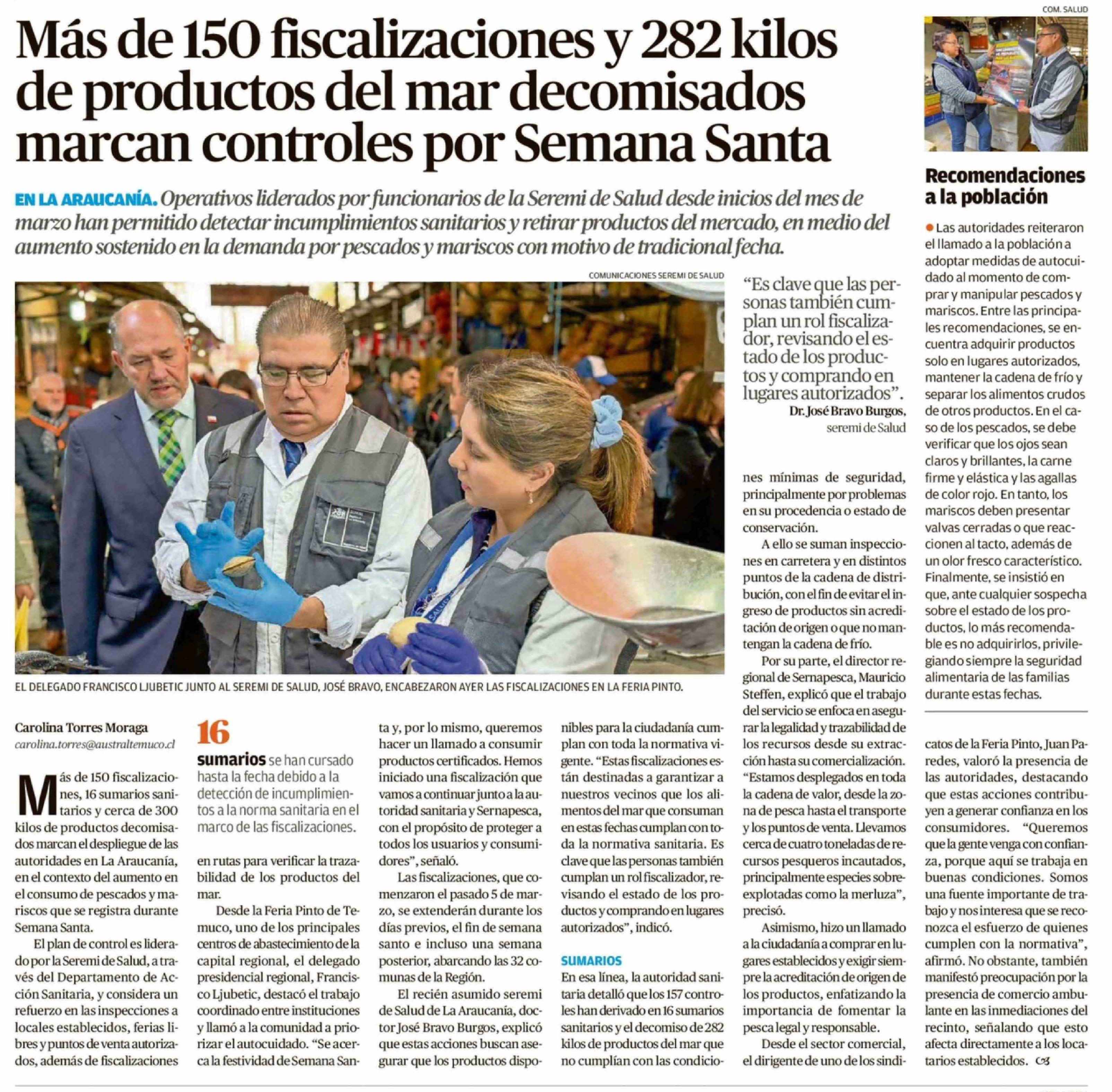 Más de 150 fiscalizaciones y 282 kilos de productos del mar decomisados marcan controles por Semana Santa 28-03-2026 El Austral de la Araucanía |