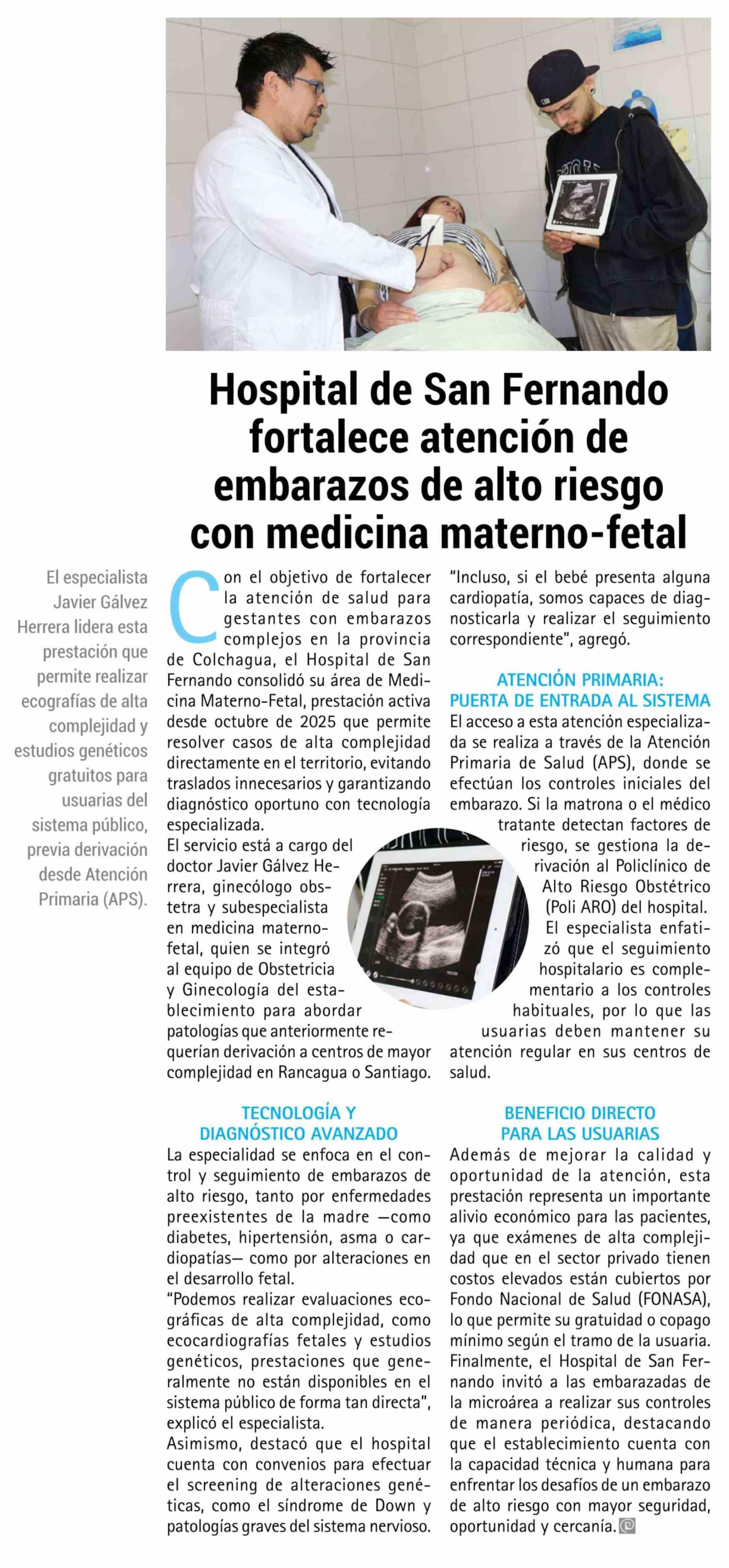 Hospital de San Fernando fortalece atención de embarazos de alto riesgo con medicina materno-fetal 19-02-2026 El Rancagüino |