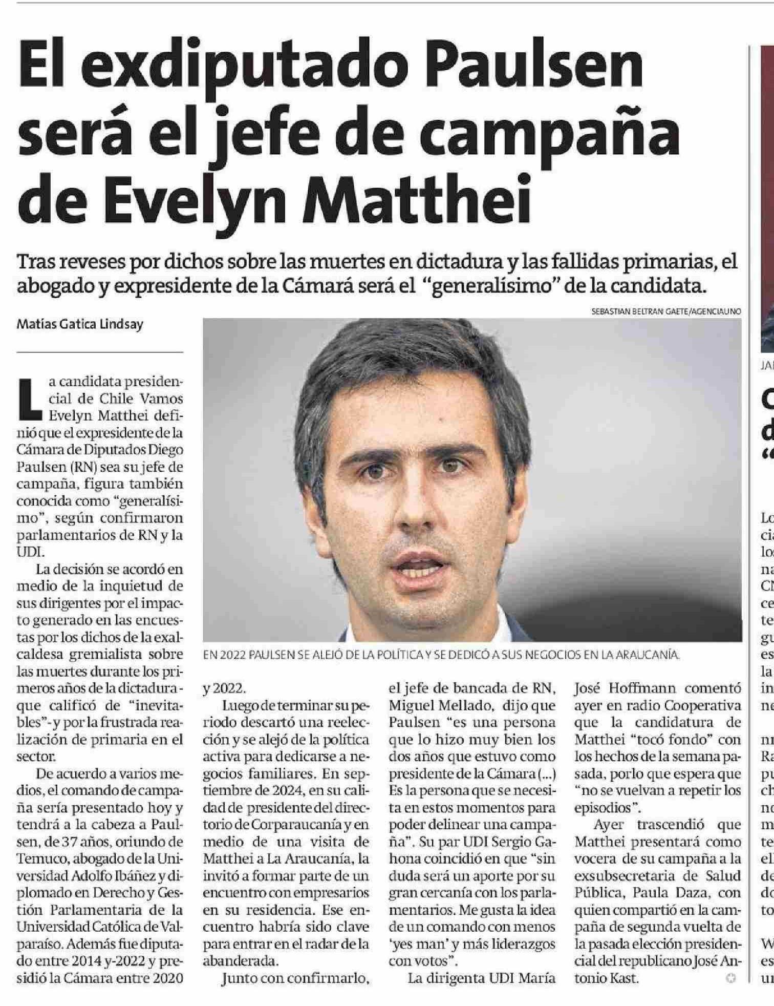 El exdiputado Paulsen será el jefe de campaña de Evelyn Matthei 24-04-2025 La Estrella de Iquique |