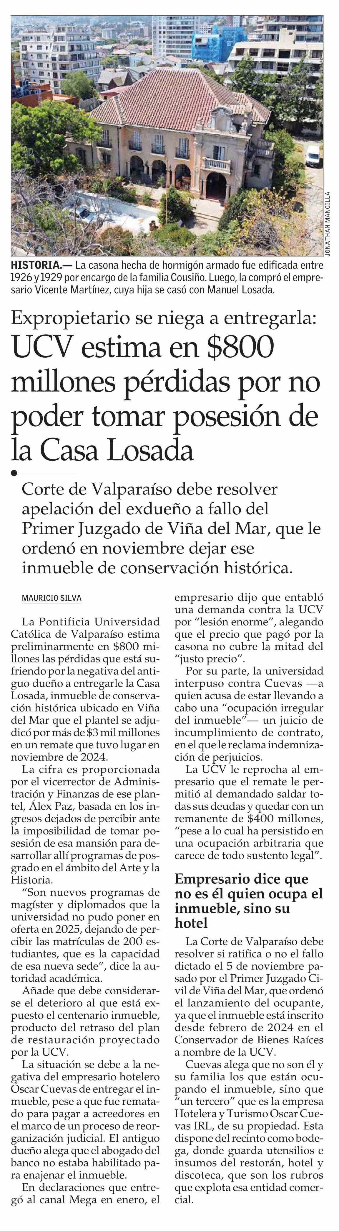 UCV estima en $800 millones pérdidas por no poder tomar posesión de la Casa Losada 16-03-2026 El Mercurio |