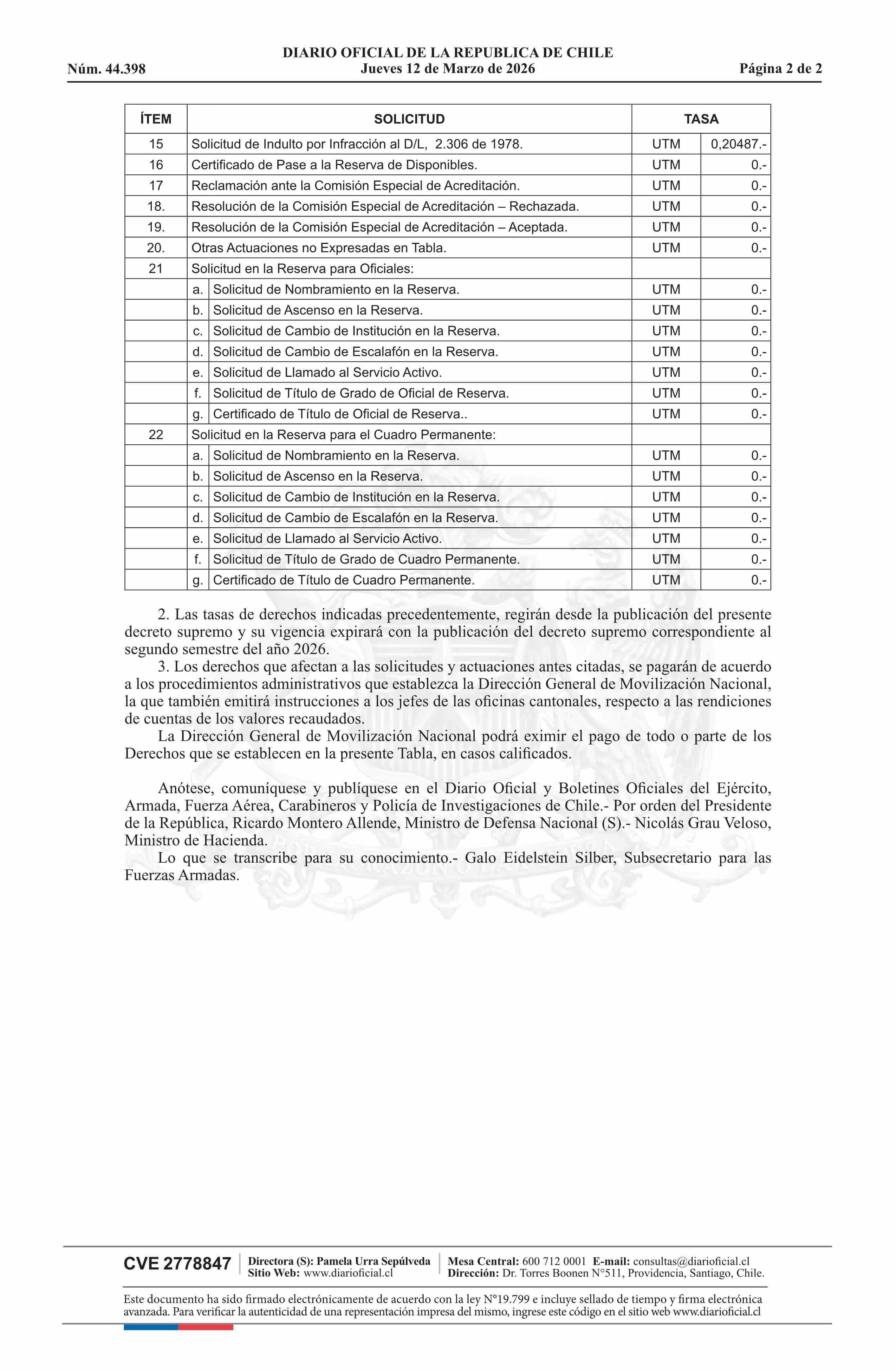 Título: Decreto exento número 3, de 2026.- Fija tasas de derechos a solicitudes y actuaciones del DL N° 2.306, de 1978, que dicta normas sobre reclutamiento y movilización de las Fuerzas Armadas