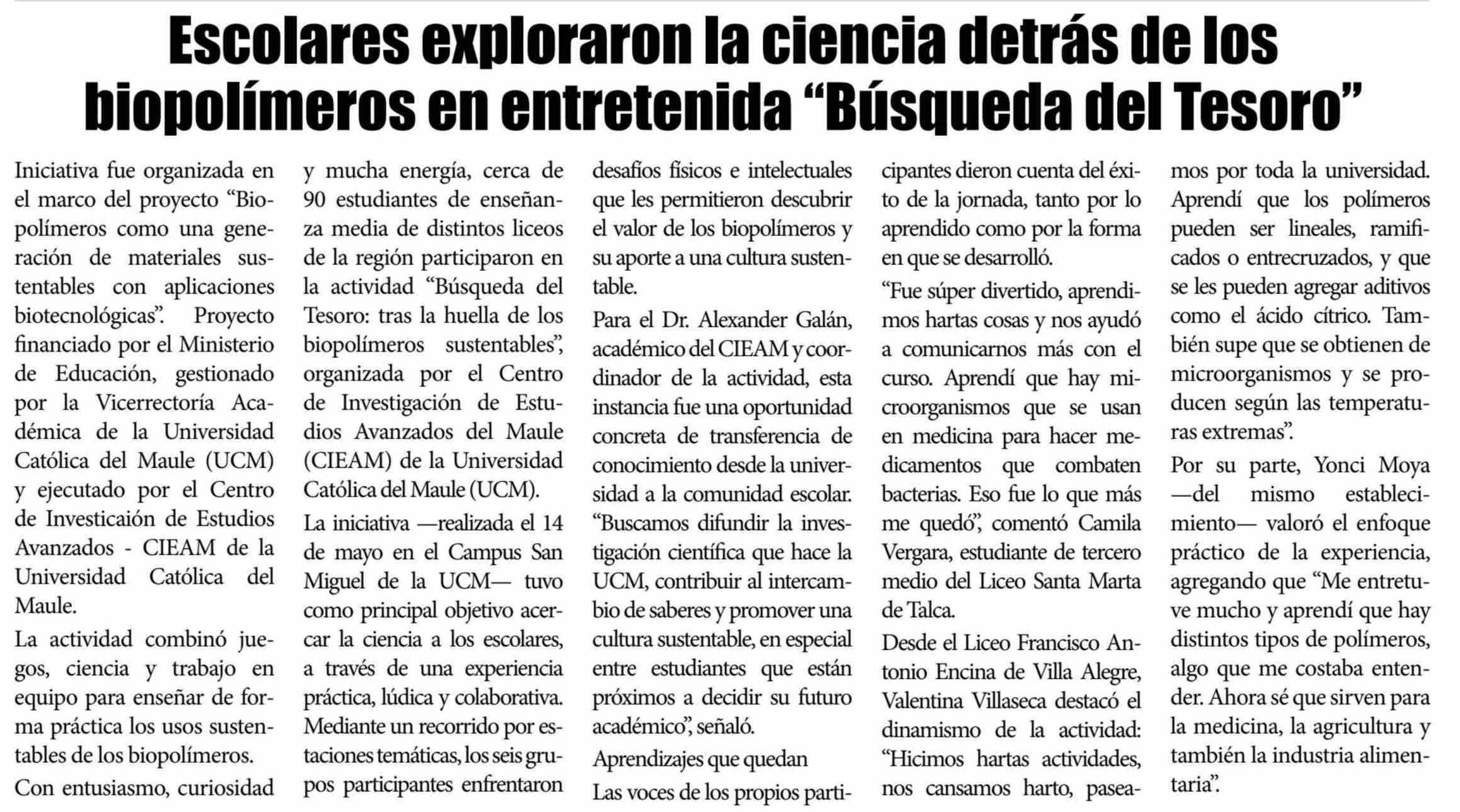 | Título: | Escolares exploraron la ciencia detrás de los biopolímeros en entretenida “Búsqueda del Tesoro” |