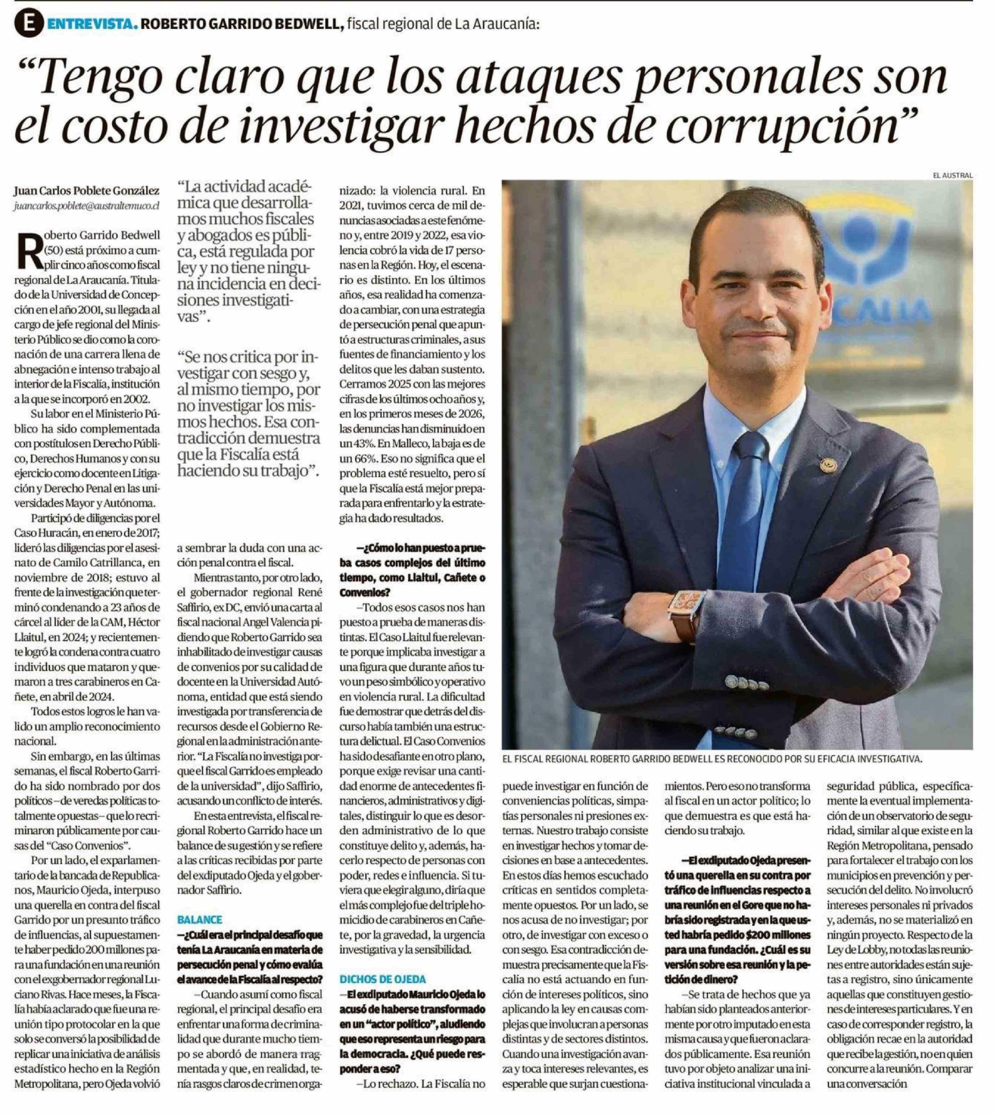 "Tengo claro que los ataques personales son el costo de investigar hechos de corrupción" 20-04-2026 El Austral de la Araucanía |