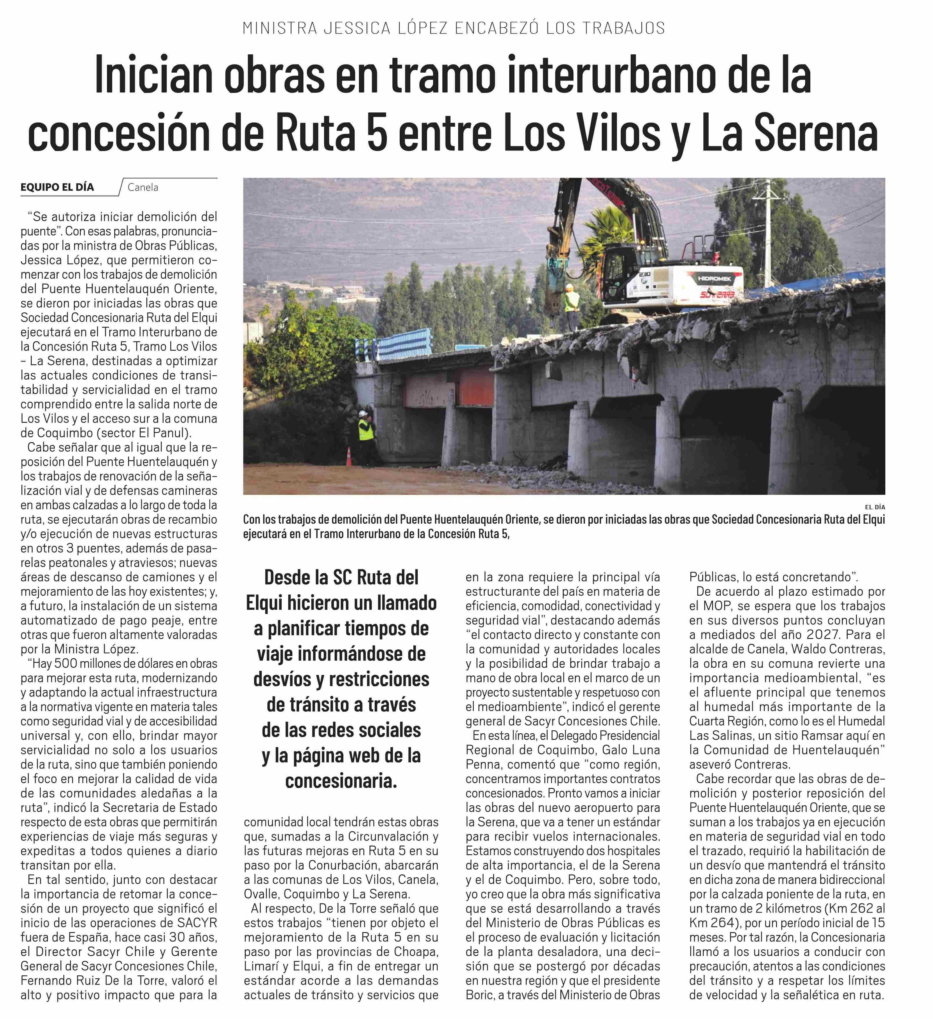 Inician obras en tramo interurbano de la concesión de Ruta 5 entre Los Vilos y La Serena 22-05-2025 El Día |