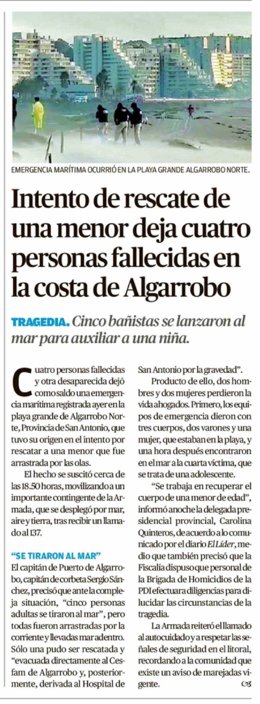 Intento de rescate de una menor deja cuatro personas fallecidas en la costa de Algarrobo 10-03-2026 El Mercurio de Valparaíso |