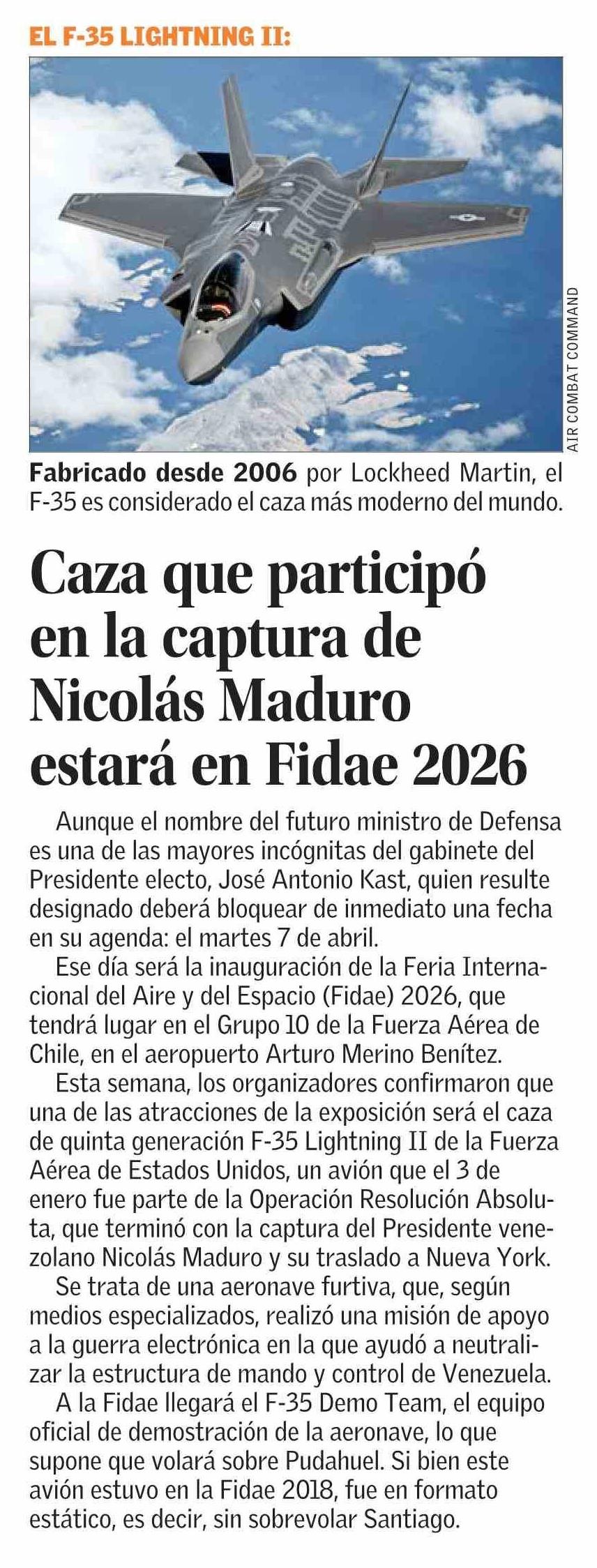 Caza que participó en la captura de Nicolás Maduro estará en Fidae 2026 18-01-2026 El Mercurio |