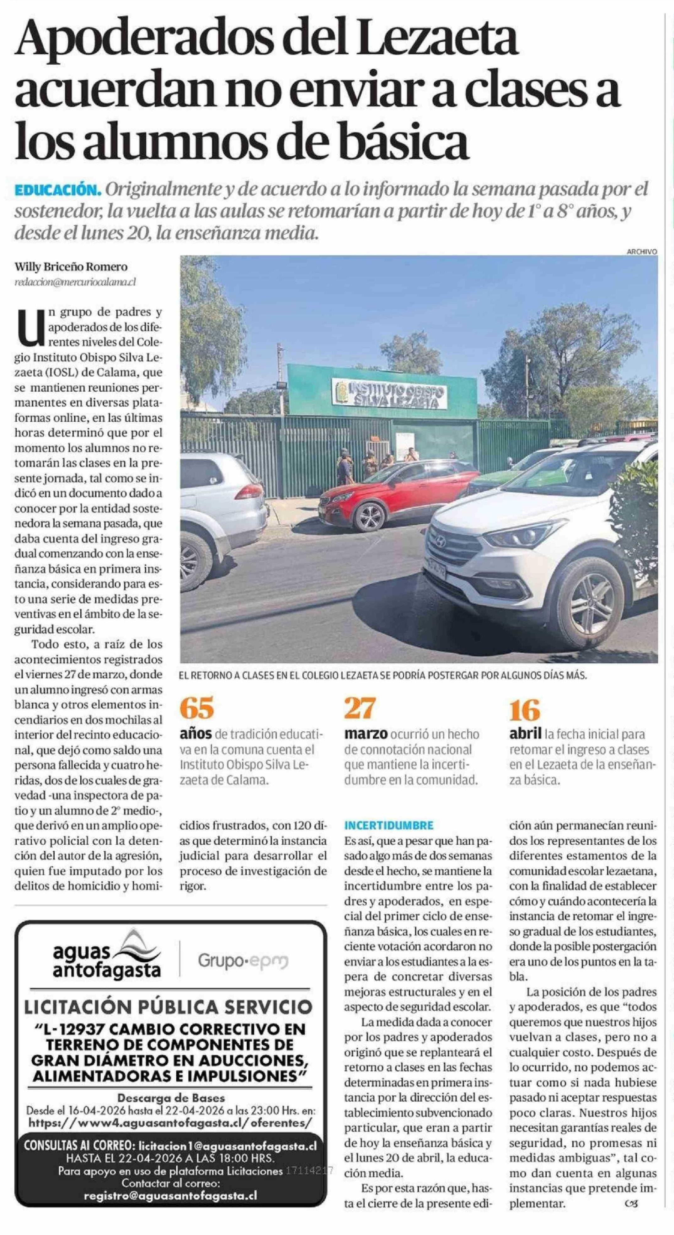 Apoderados del Lezaeta acuerdan no enviar a clases a los alumnos de básica 16-04-2026 El Mercurio de Antofagasta |