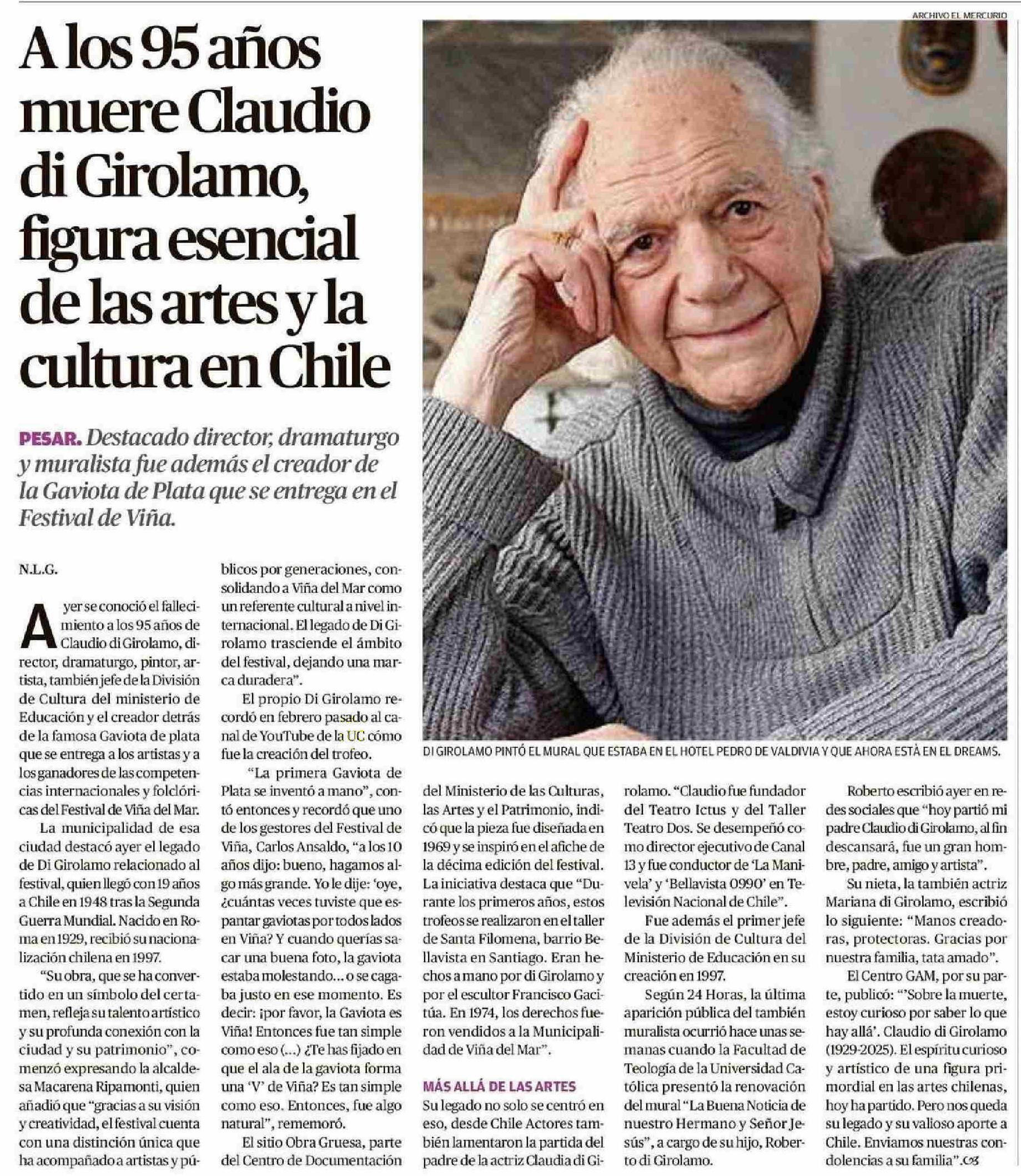 Alos 95 años muere Claudio di Girolamo, figura esencial de las artes y la cultura en Chile 23-05-2025 Diario Austral Región de Los Ríos |