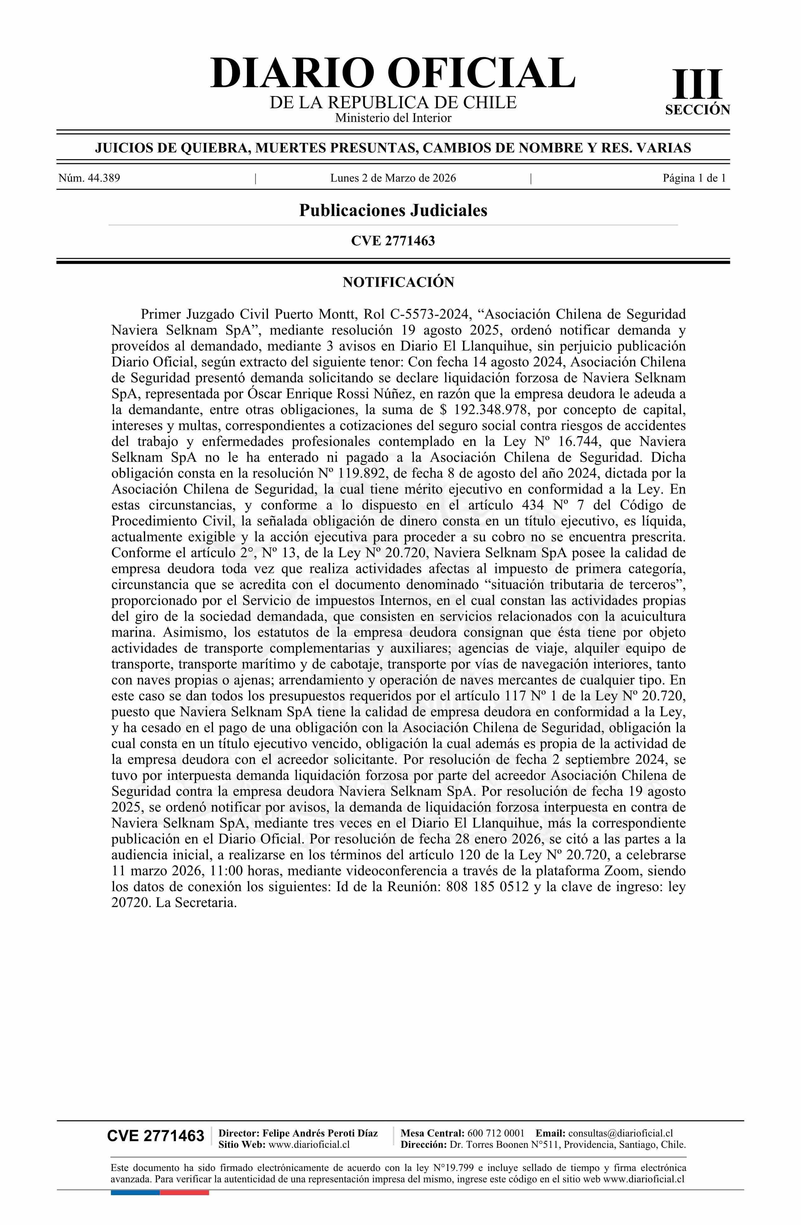 Asociación Chilena de Seguridad - Naviera Selknam SpA 02-03-2026 Diario Oficial Edición Electrónica |