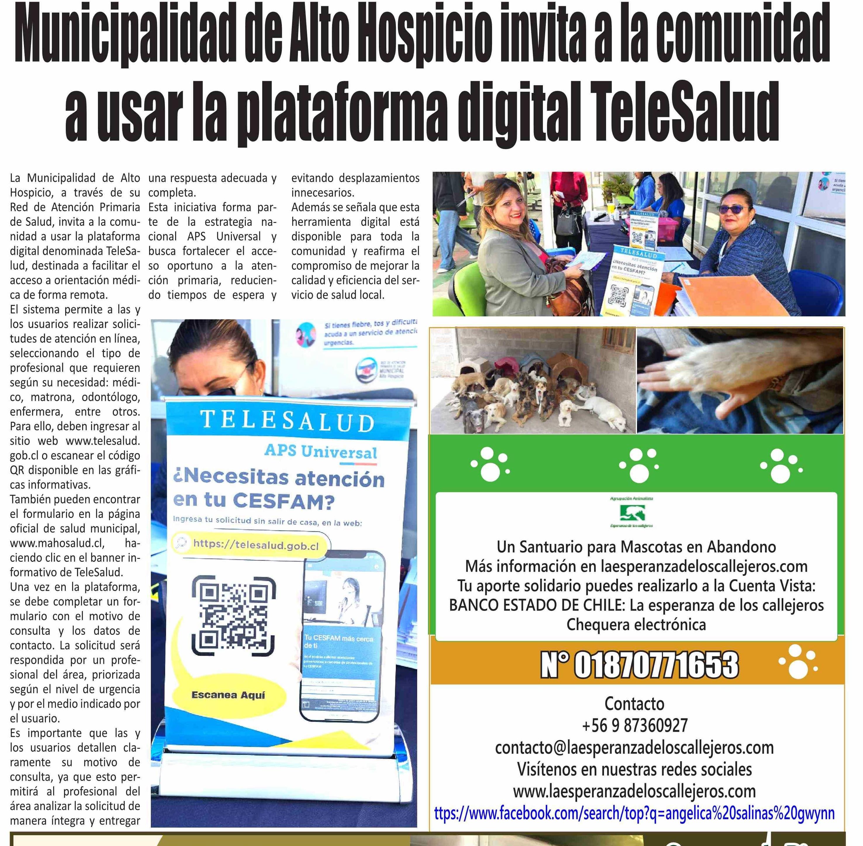 | Título: | Municipalidad de Alto Hospicio invita a la comunidad a usar la plataforma digital TeleSalud |
