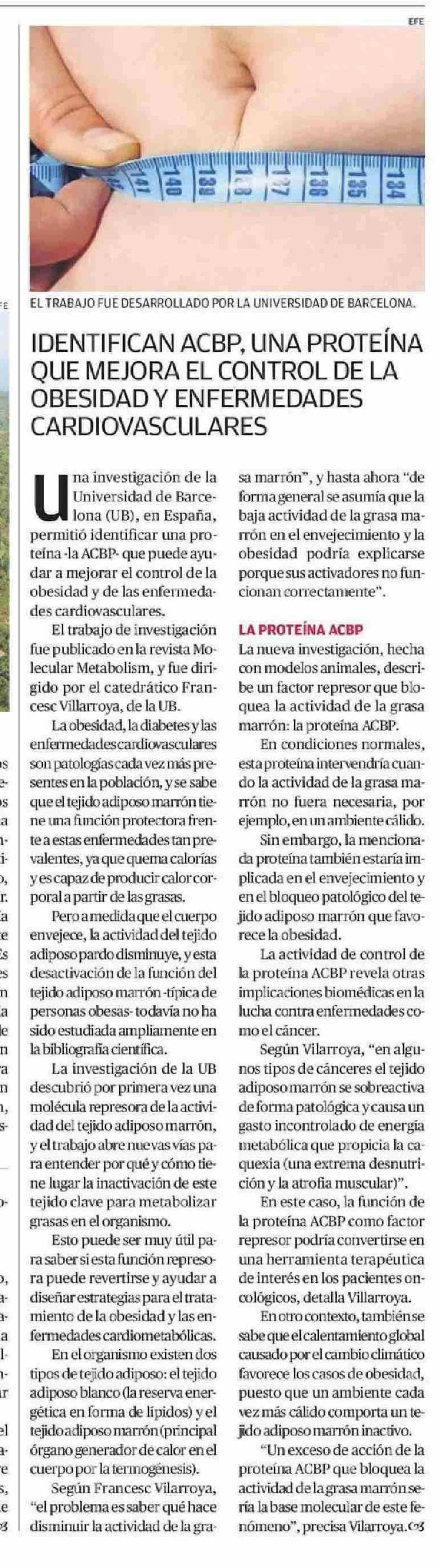 IDENTIFICAN ACBP, UNA PROTEÍNA OBESIDAD Y ENFERMEDADES QUE MEJORA EL CONTROL DE LA CARDIOVASCULARES 18-06-2025 El Diario de Atacama |
