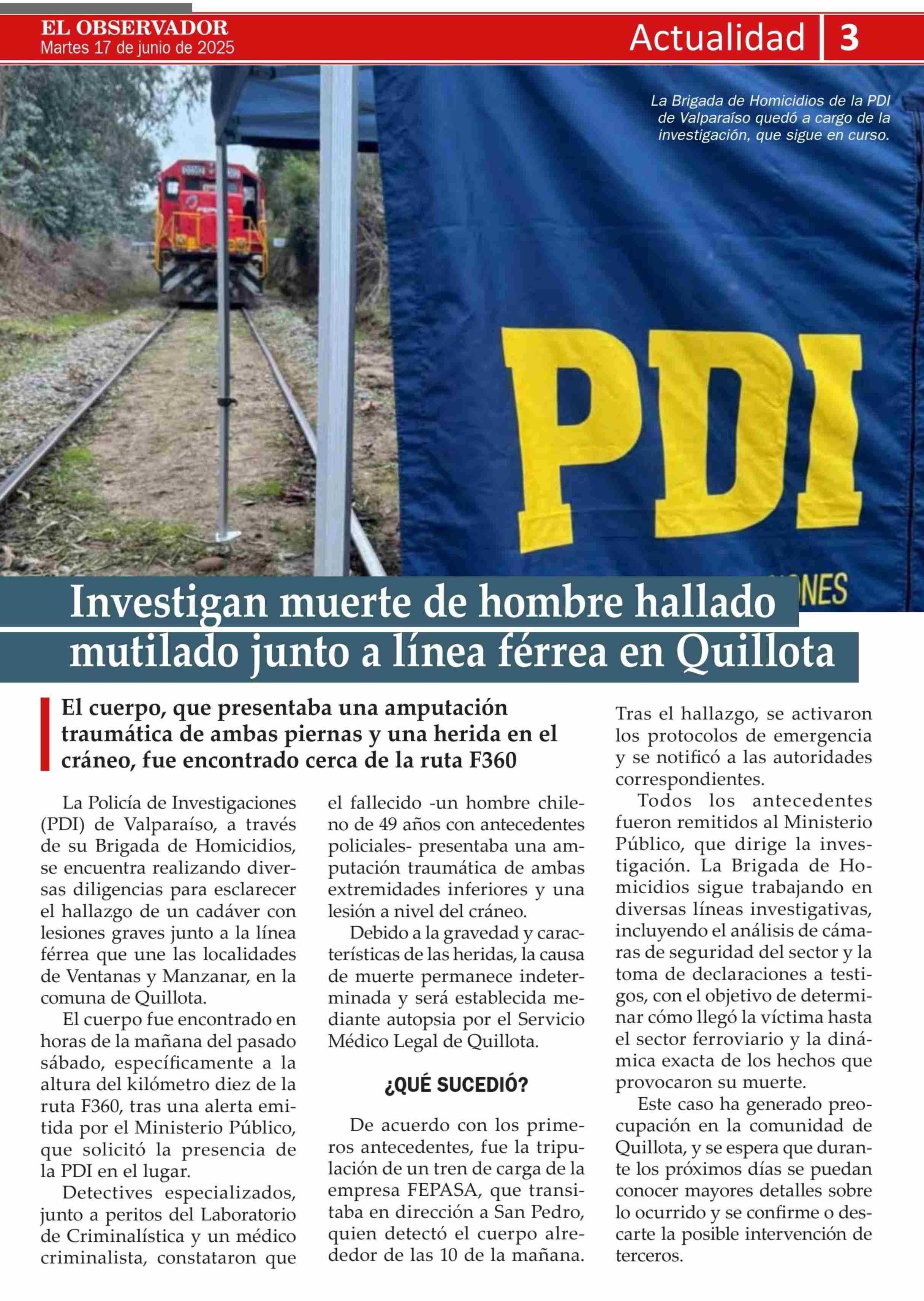 Investigan muerte de hombre hallado mutilado junto a línea férrea en Quillota 17-06-2025 El Observador |