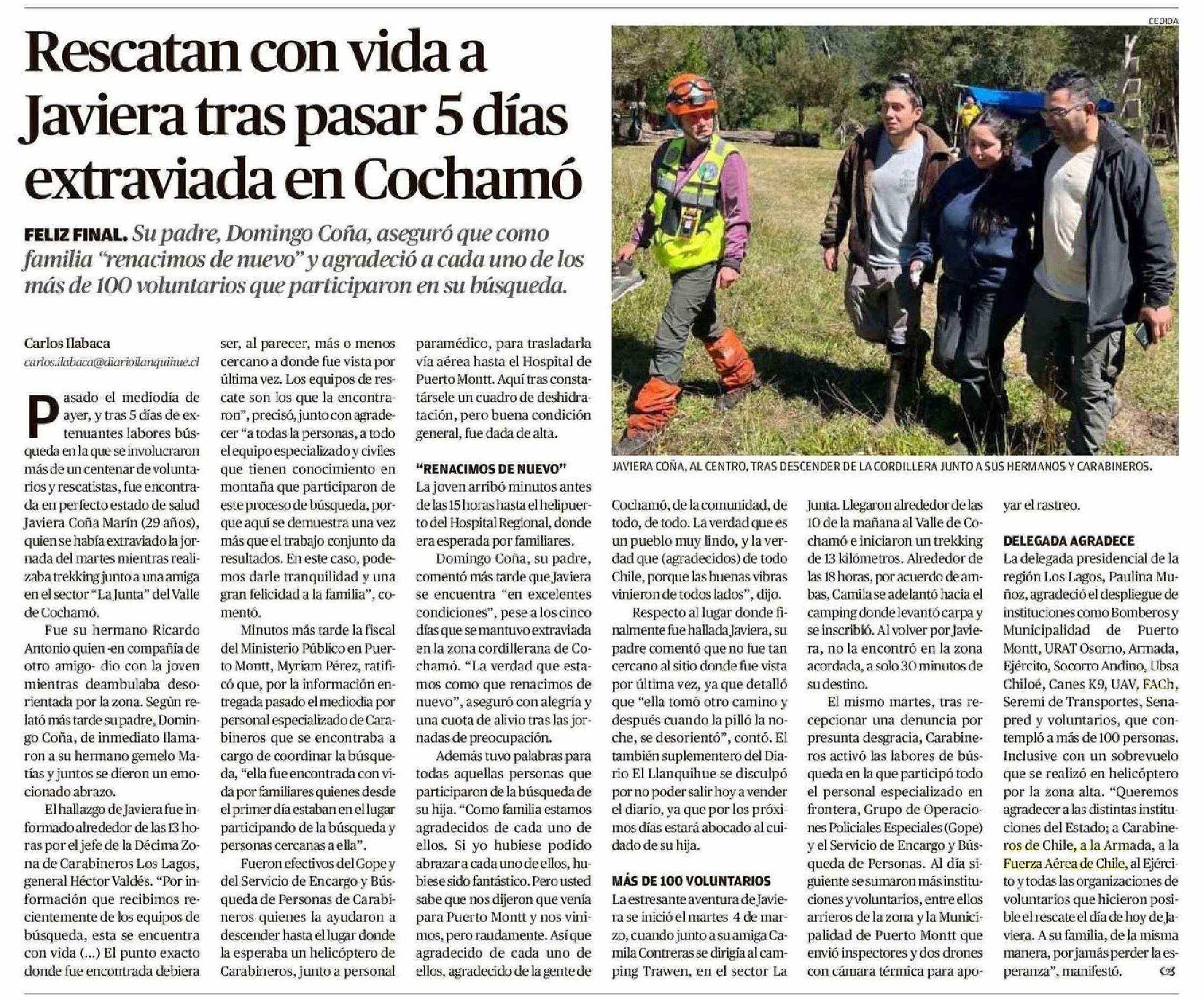Rescatan con vida a Javiera tras pasar 5 días extraviada en Cochamó 10-03-2025 El Llanquihue |