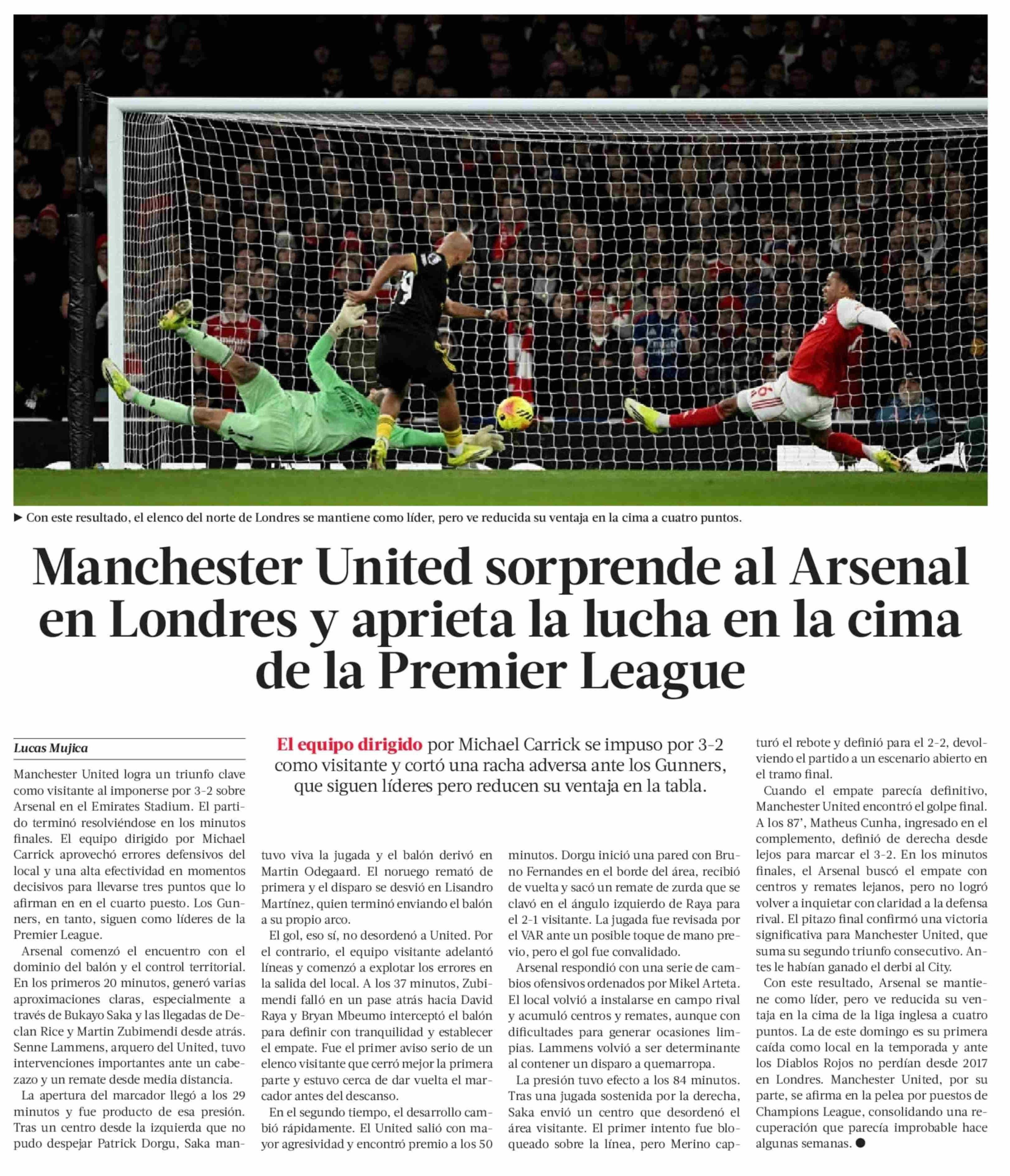 | Título: | Manchester United sorprende al Arsenal en Londres y aprieta la lucha en la cima de la Premier League |