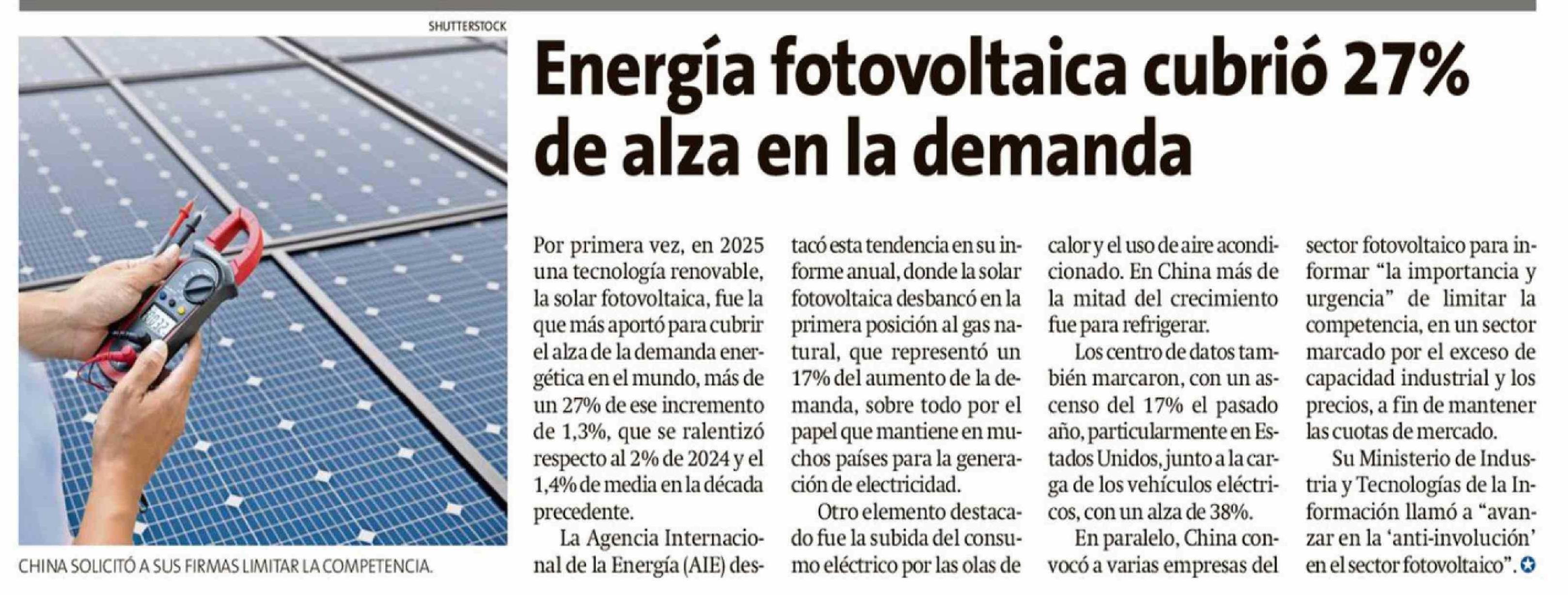 Título: Energía fotovoltaica cubrió 27% de alza en la demanda