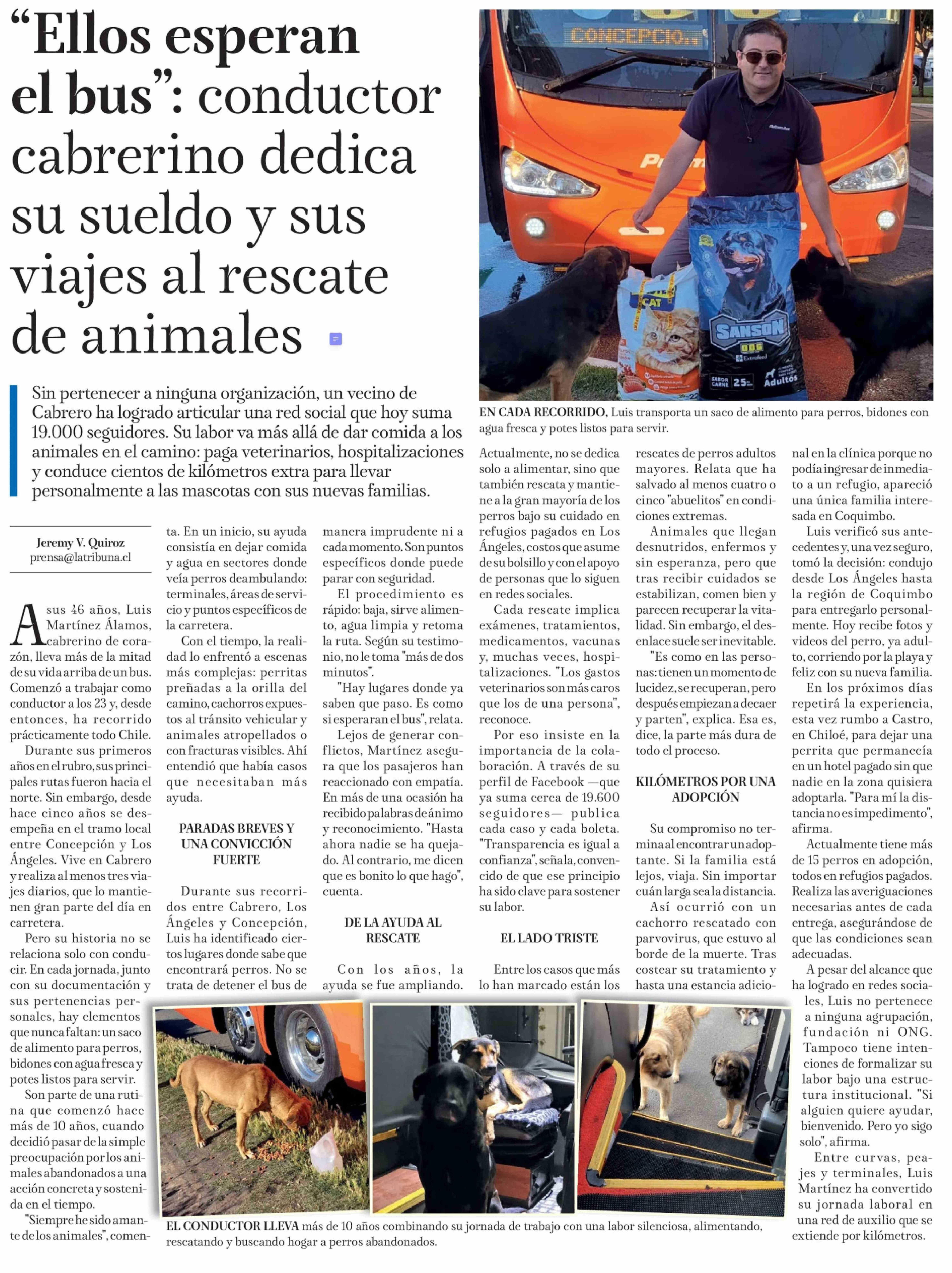 "Ellos esperan el bus": conductor cabrerino dedica su sueldo y sus viajes al rescate de animales 03-02-2026 La Tribuna |