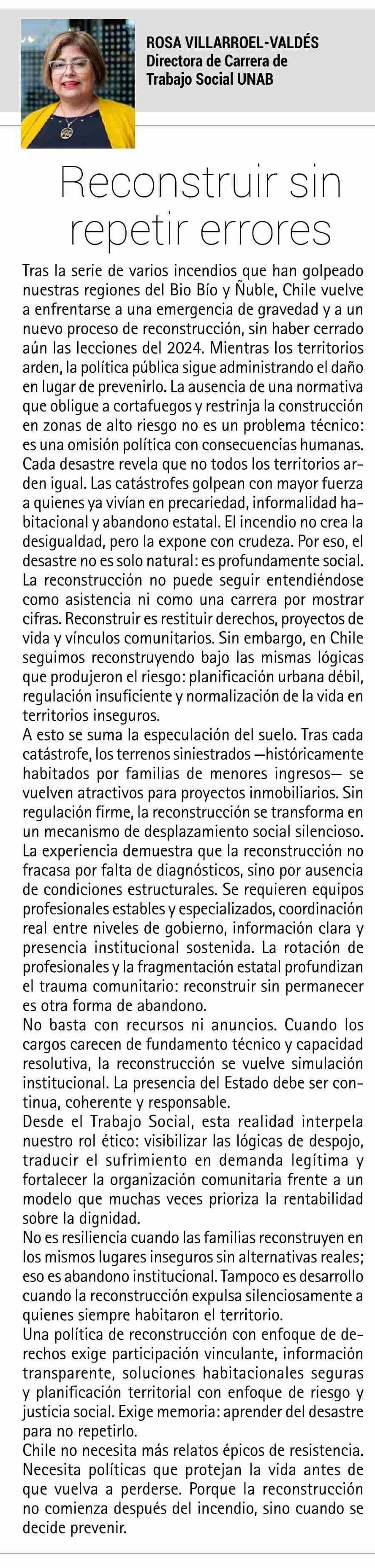 Columnas de Opinión: Reconstruir sin repetir errores 21-01-2026 El Rancagüino |