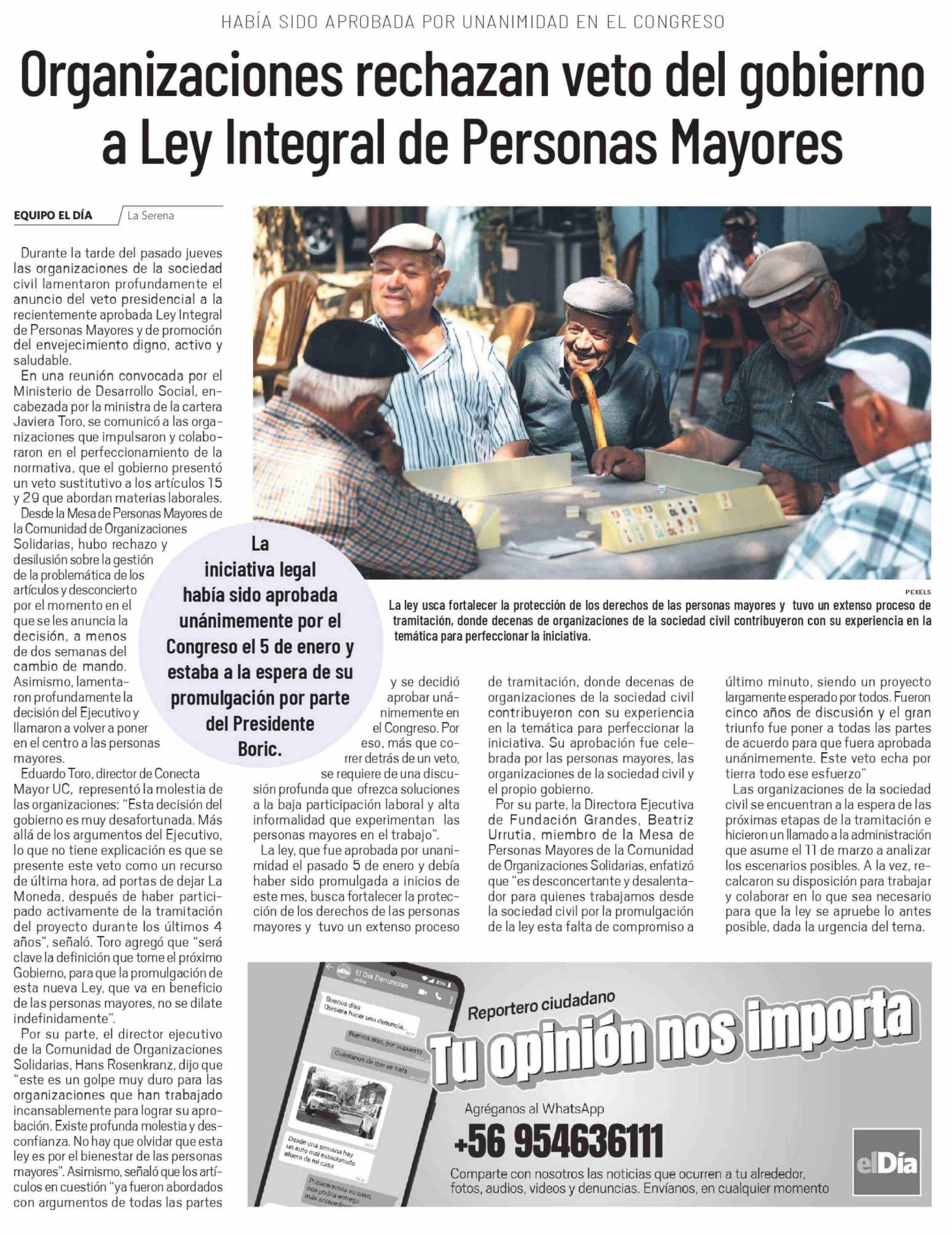 Título: Organizaciones rechazan veto del gobierno a Ley Integral de Personas Mayores