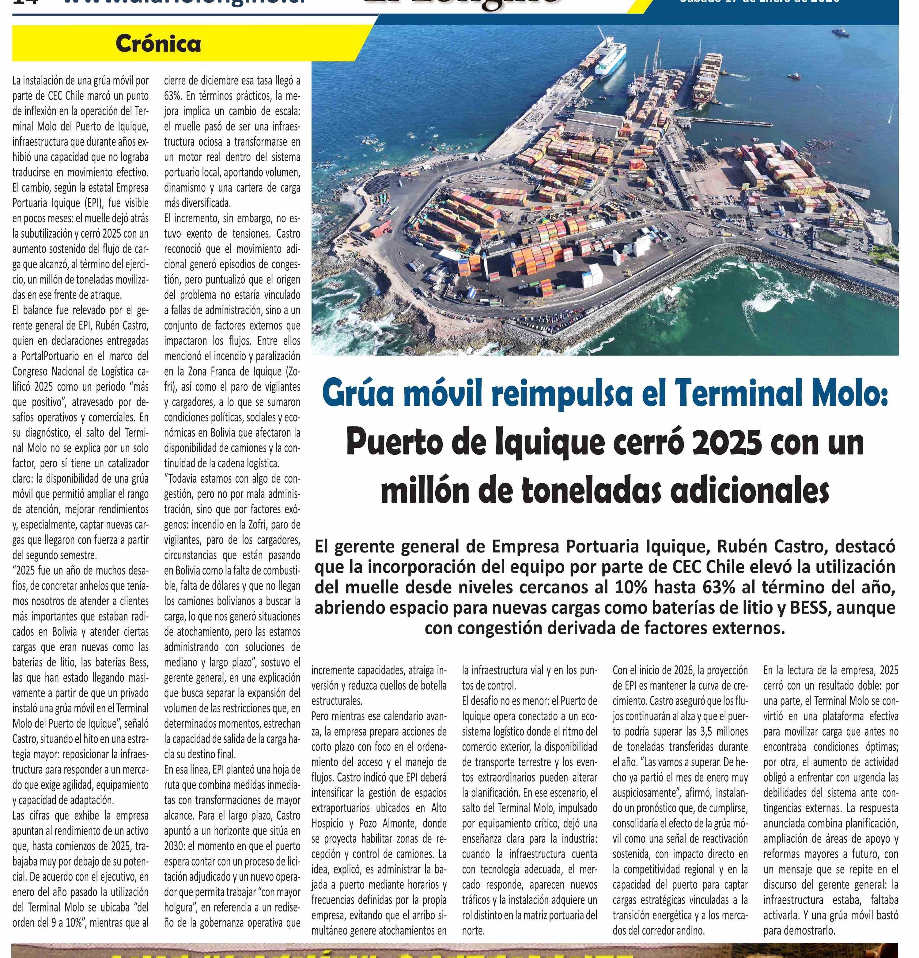 | Título: | Grúa móvil reimpulsa el Terminal Molo: Puerto de Iquique cerró 2025 con un millón de toneladas adicionales |