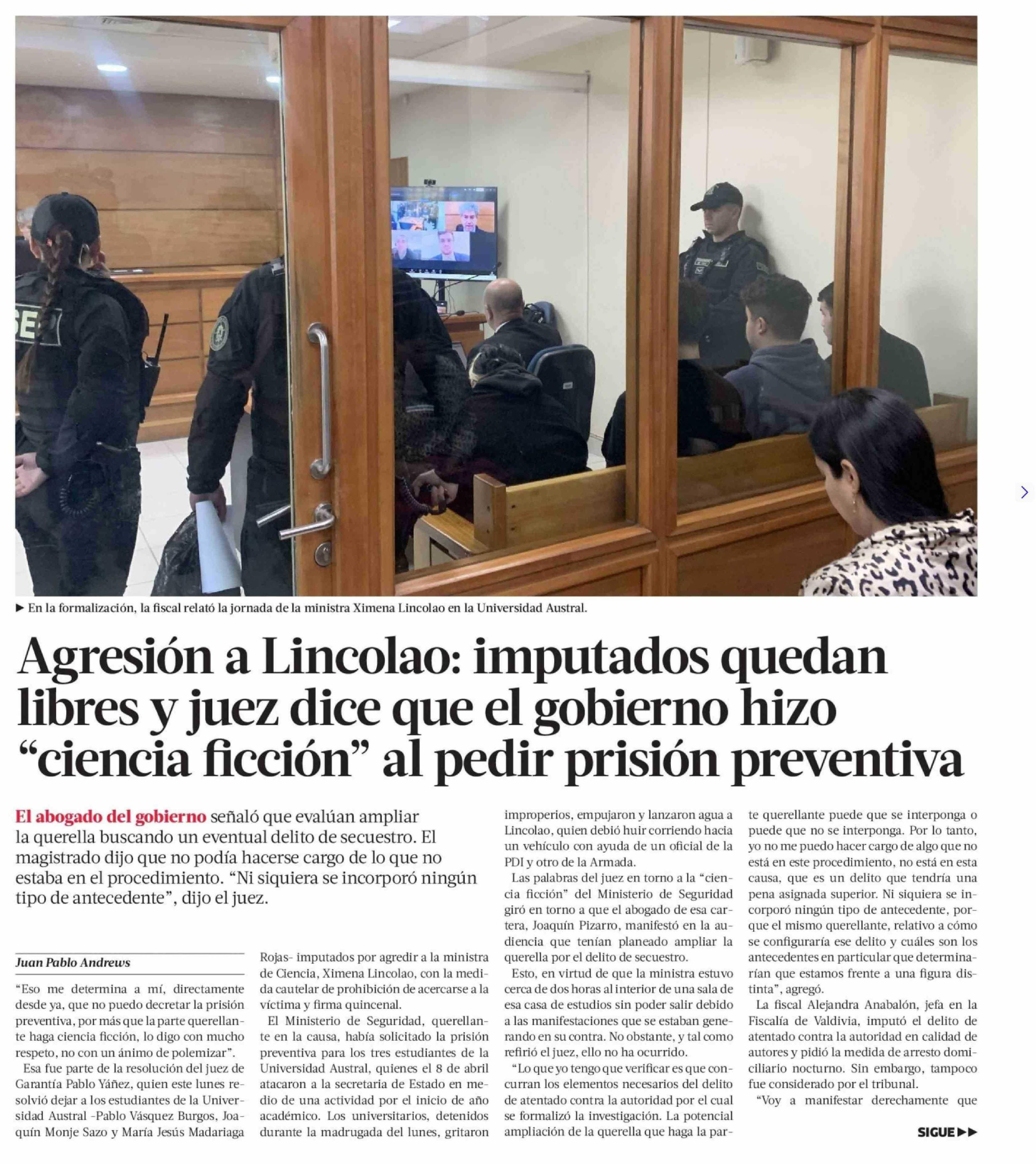 Agresión a Lincolao: imputados quedan libres y juez dice que el gobierno hizo "ciencia ficción" al pedir prisión preventiva 21-04-2026 La Tercera |