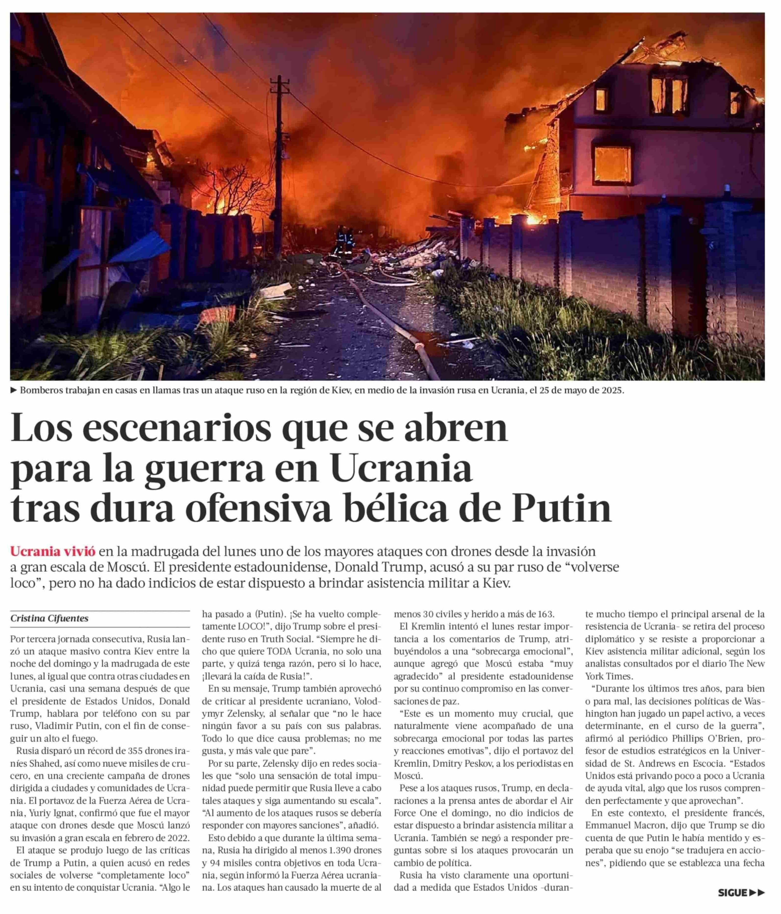 Los escenarios que se abren para la guerra en Ucrania tras dura ofensiva bélica de Putin 27-05-2025 La Tercera |