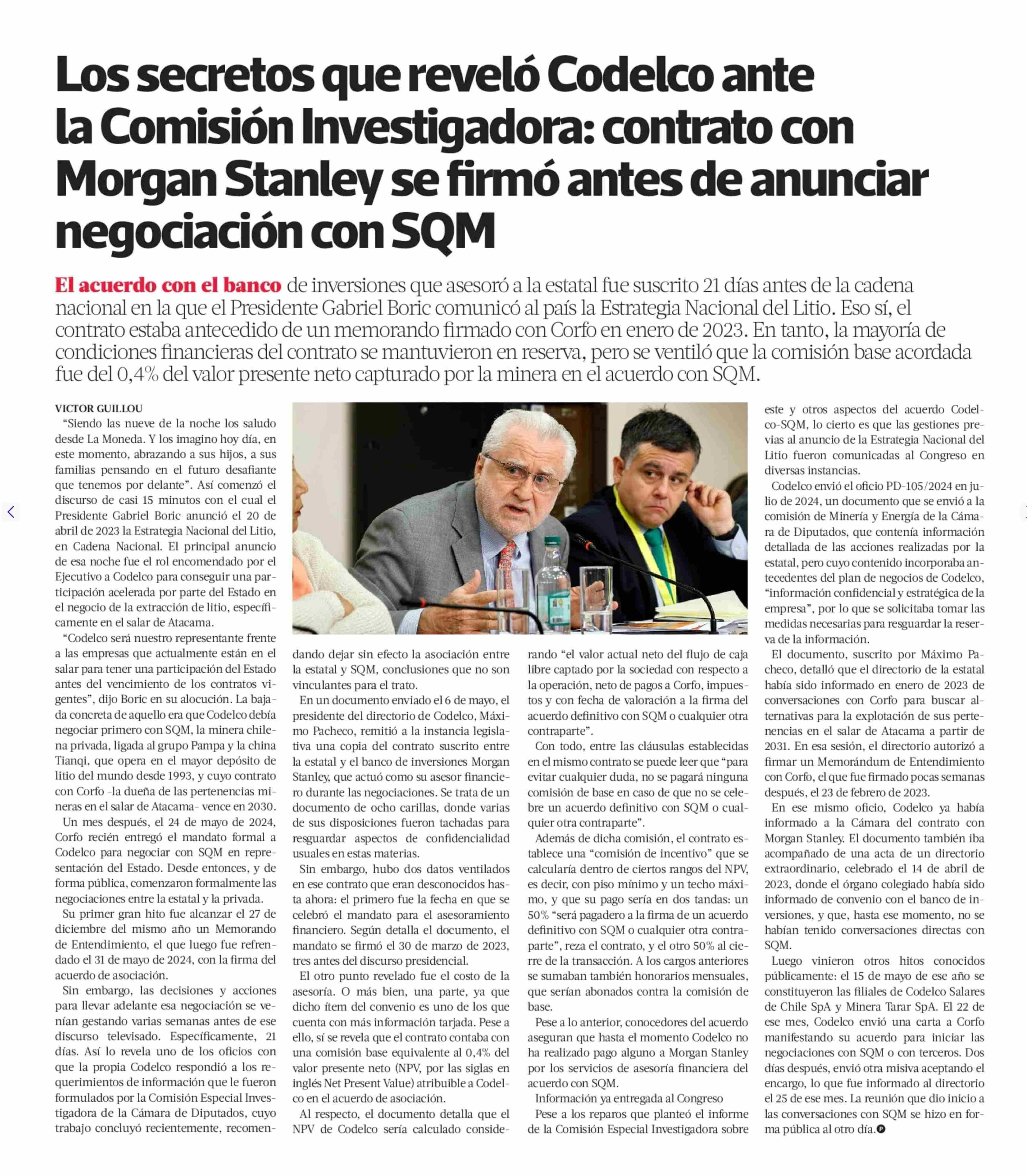| Título: | Los secretos que reveló Codelco ante la Comisión Investigadora: contrato con Morgan Stanley se firmó antes de anunciar neaociación conSOM |