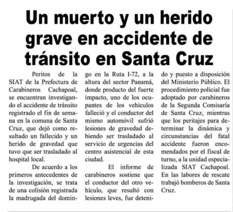 Un muerto y un herido grave en accidente de tránsito en Santa Cruz 10-06-2025 Diario VI Región |