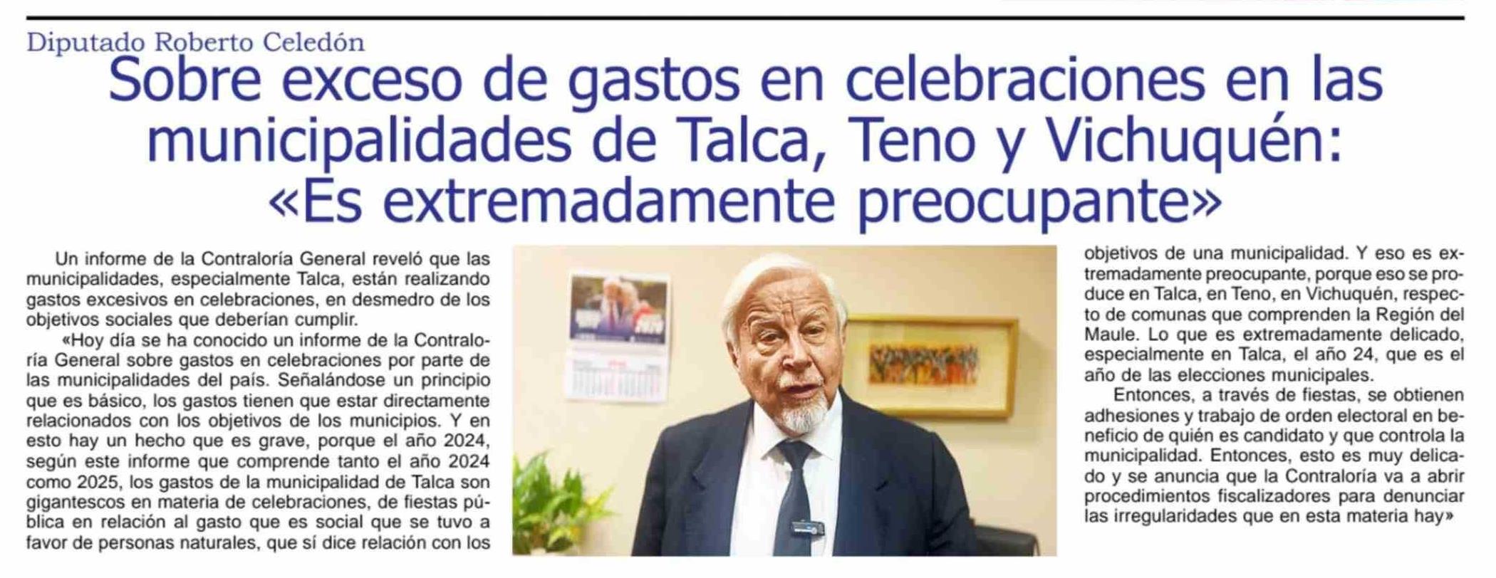 | Título: | Sobre exceso de gastos en celebraciones en las municipalidades de Talca, Teno y Vichuquén: «Es extremadamente preocupante» |