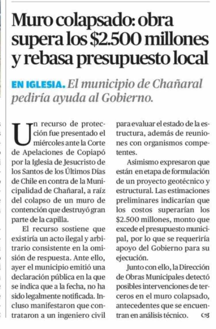 Muro colapsado: obra supera los $2.500 millones y rebasa presupuesto local 17-02-2026 El Diario de Atacama |