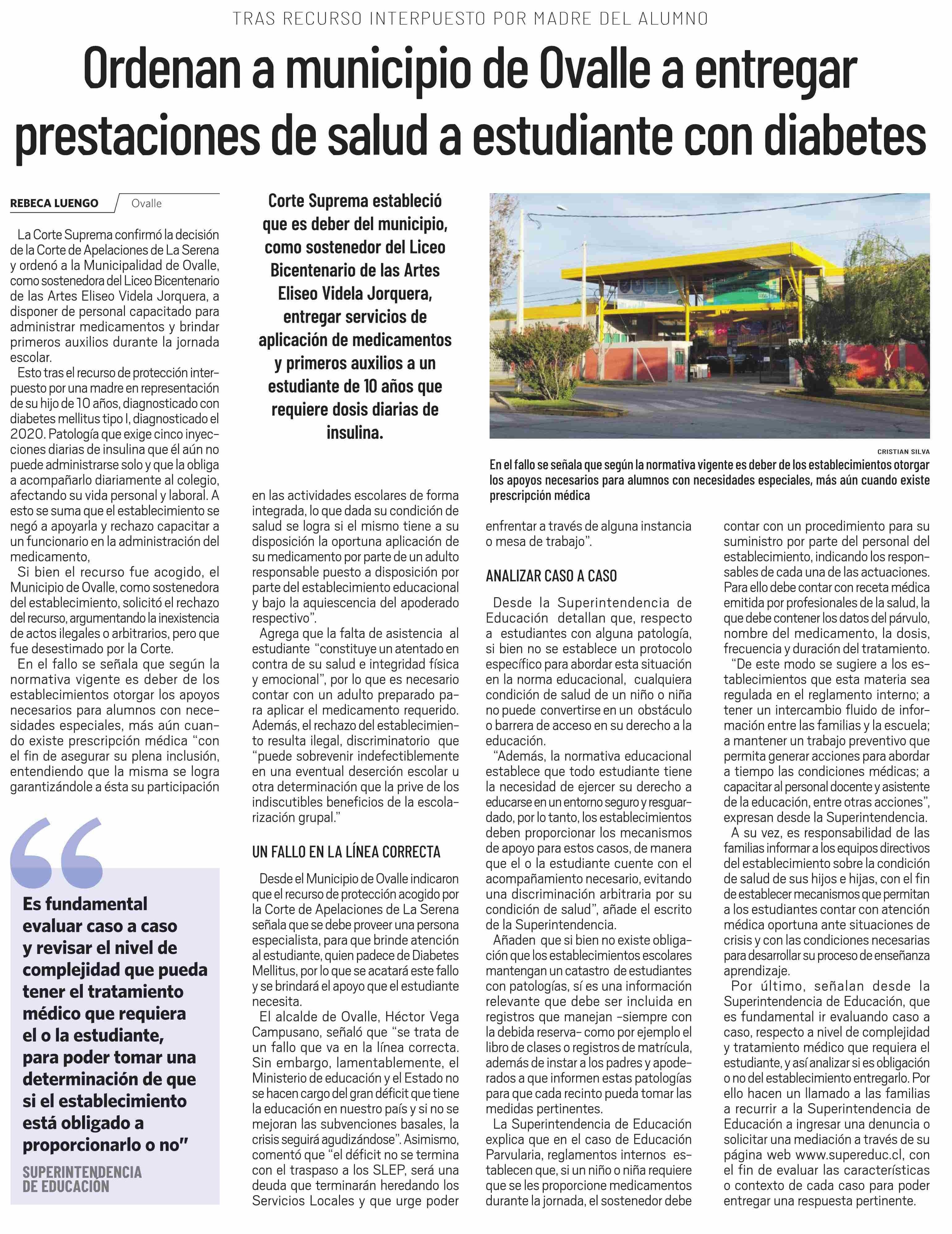 Ordenan a municipio de Ovalle a entregar prestaciones de salud a estudiante con diabetes 22-06-2025 El Día |