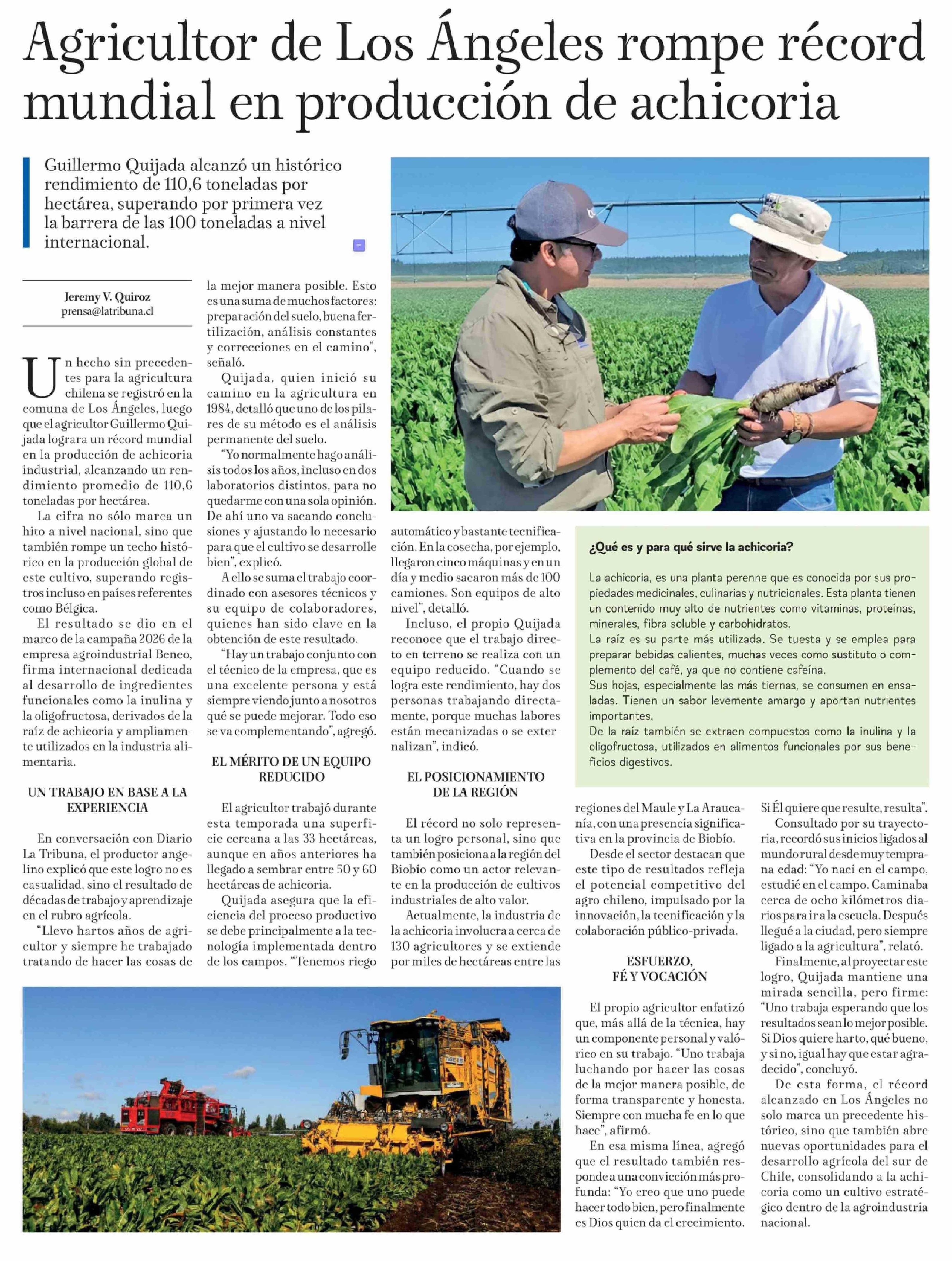 Agricultor de Los Angeles rompe récord mundial en producción de achicoria 30-03-2026 La Tribuna |