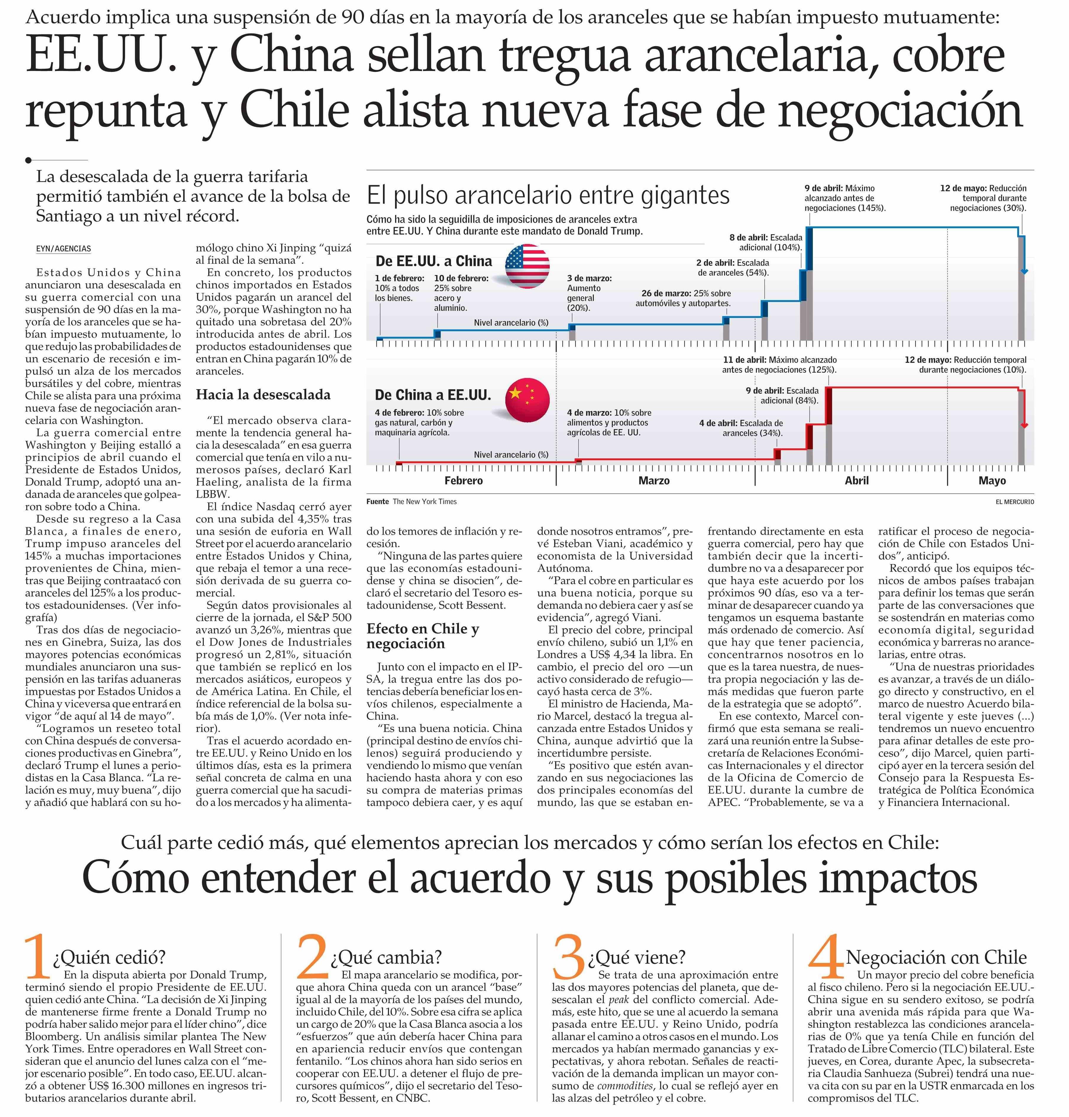 EE.UU. y China sellan tregua arancelaria, cobre repunta y Chile alista nueva fase de negociación 13-05-2025 El Mercurio |
