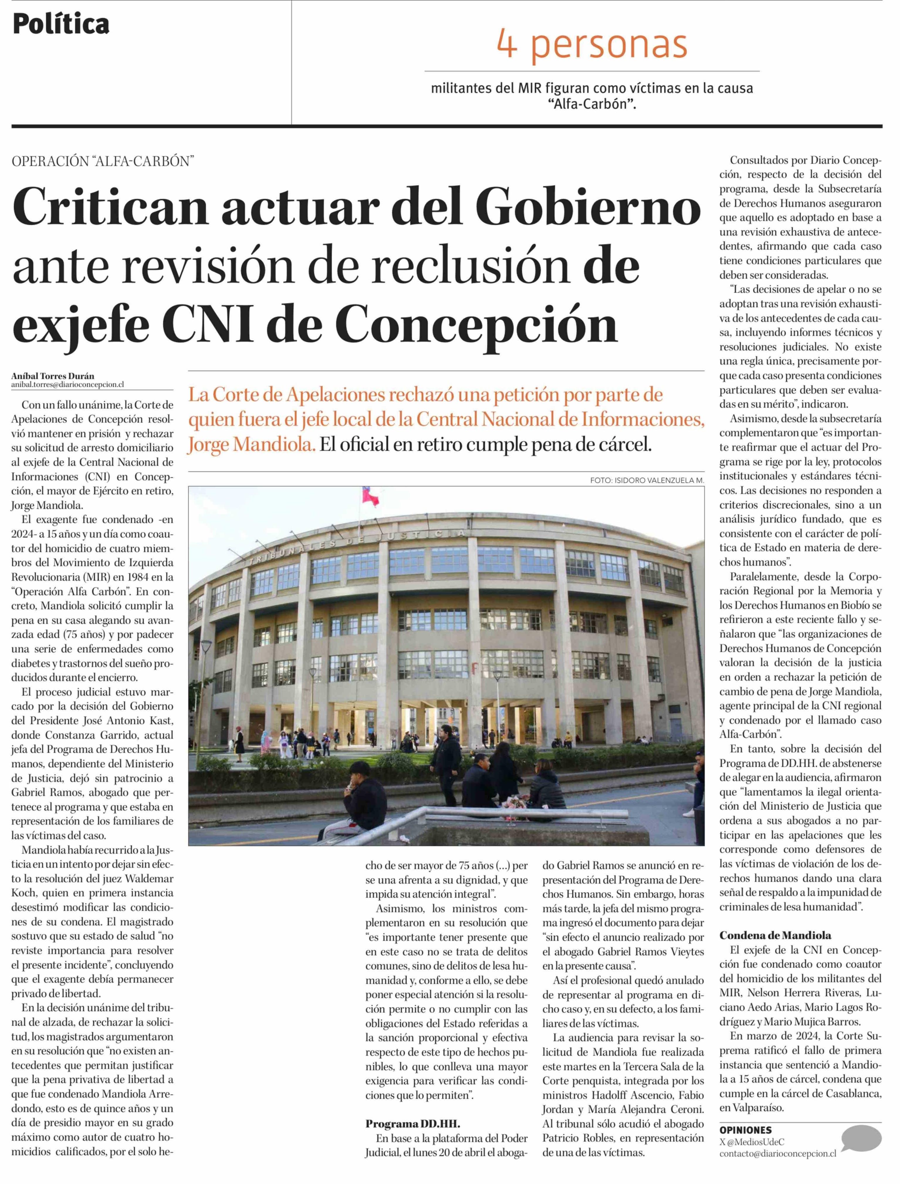 Critican actuar del Gobierno ante revisión de reclusión de exjefe CNI de Concepción 25-04-2026 Diario Concepción |