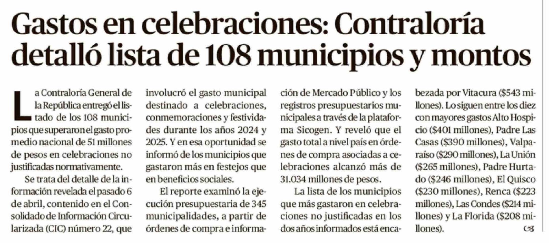 Gastos en celebraciones: Contraloría detalló lista de 108 municipios y montos 22-04-2026 El Austral de Osorno |