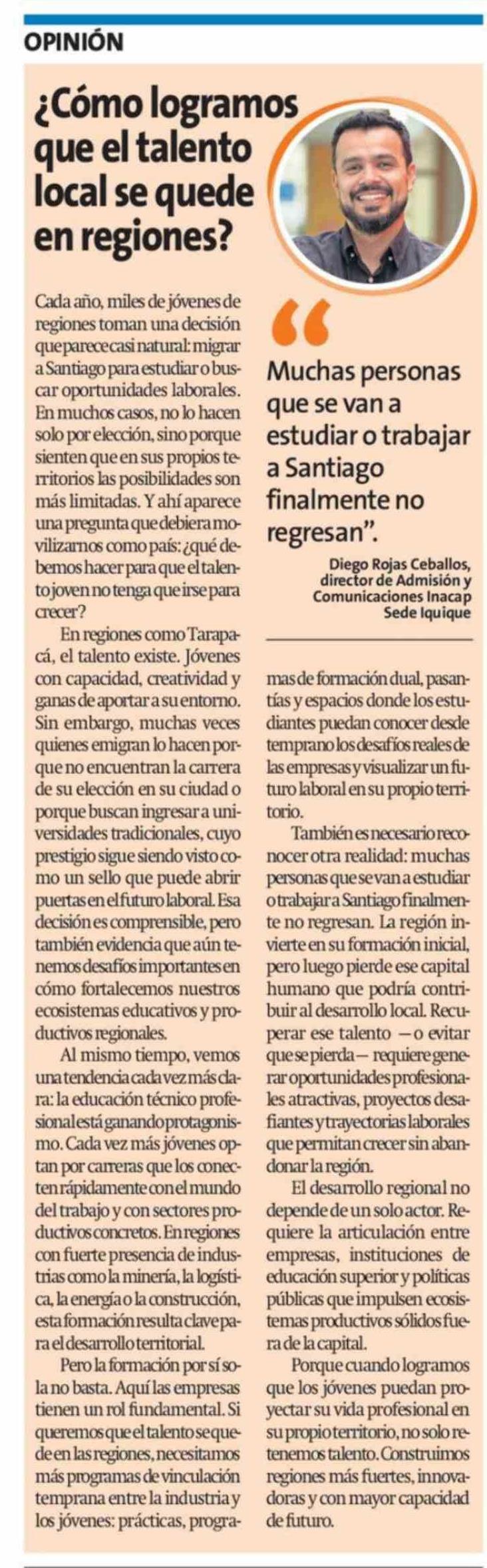 Columnas de Opinión: ¿Cómo logramos que el talento local se quede en regiones? 19-03-2026 La Estrella de Iquique |