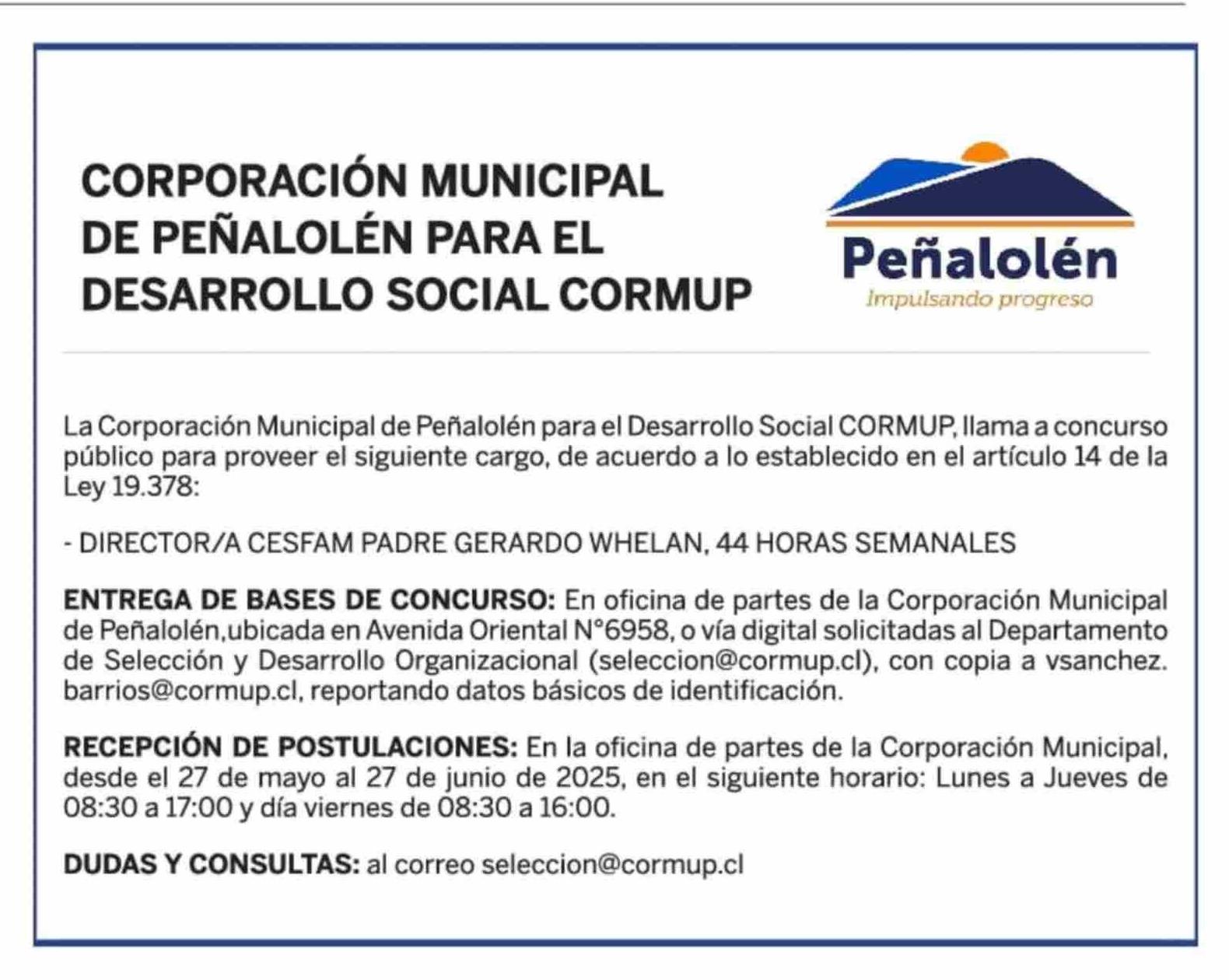 Aviso Licitaciones: CORPORACIÓN MUNICIPAL DE PEÑALOLÉN PARA EL DESARROLLO CORMUP 27-05-2025 La Tercera |