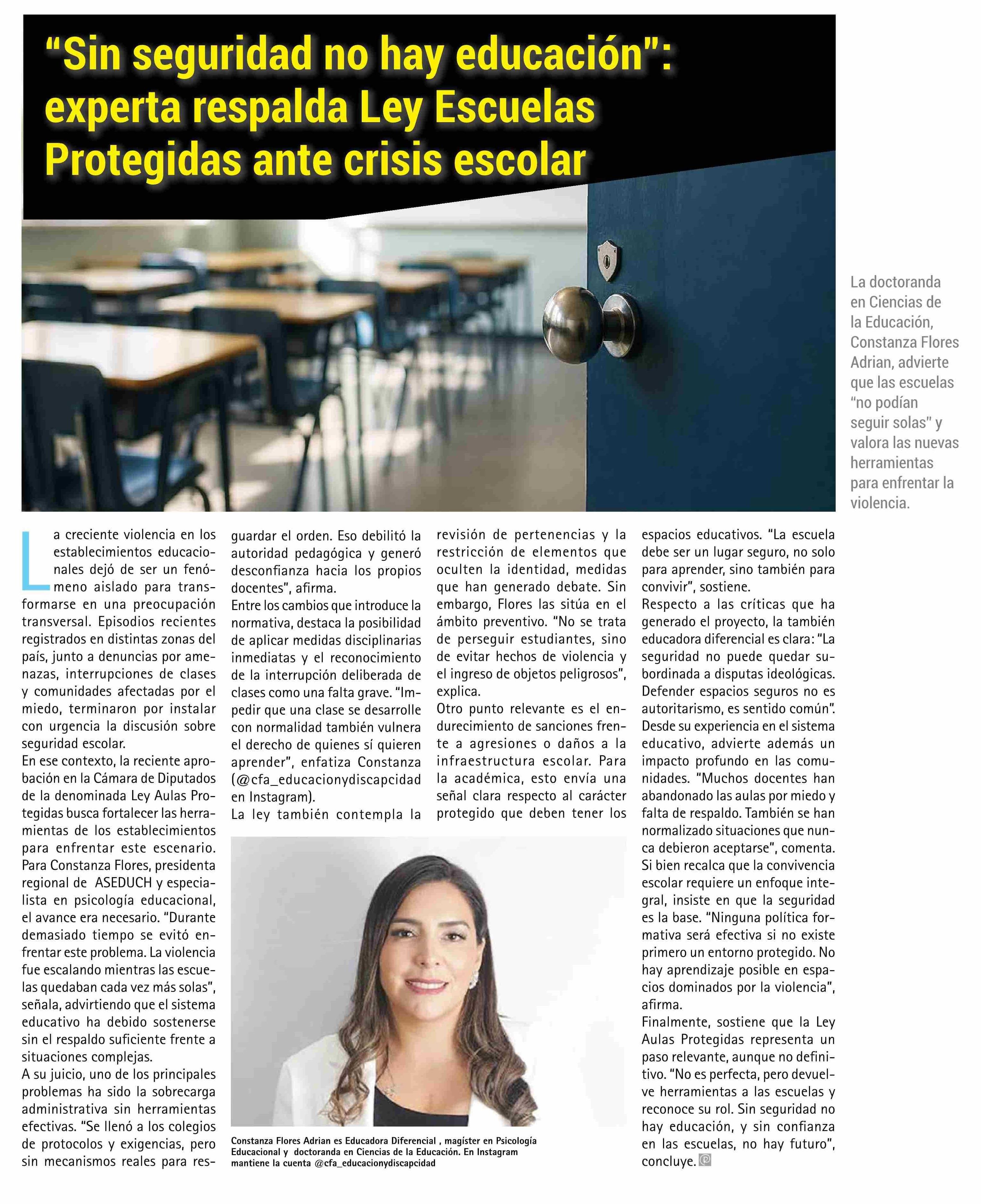 “Sin seguridad no hay educación": experta respalda Ley Escuelas Protegidas ante crisis escolar 24-04-2026 El Rancagüino |