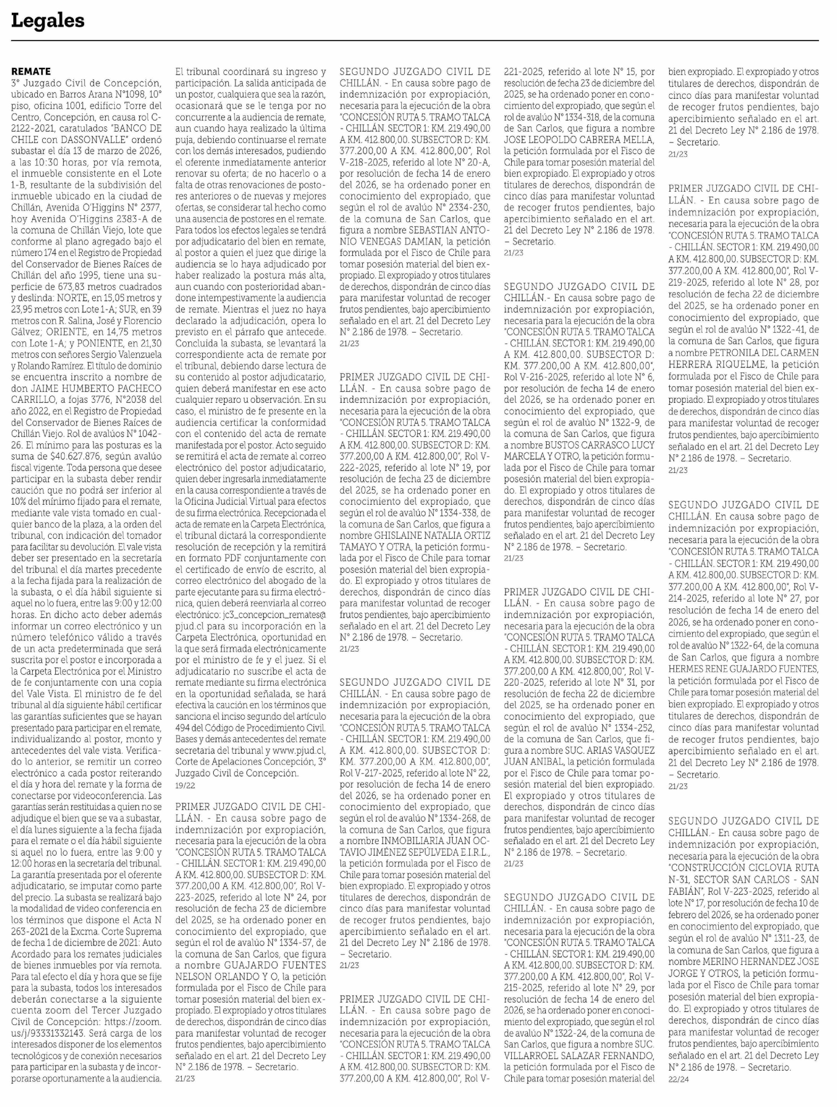 Título: REMATE 3º Juzgado Civil de Concepción, ubicado en Barros Arana Nº1098, 10° piso, oficina 1001, edificio Torre del Centro, Concepción, en causa rol C2122-2021, caratulados "BANCO DE CHILE con DASSONVALLE" ordenó subastar el día 13 de marzo de 2026, a las 10:30 horas, por vía remota, el inmueble consi
